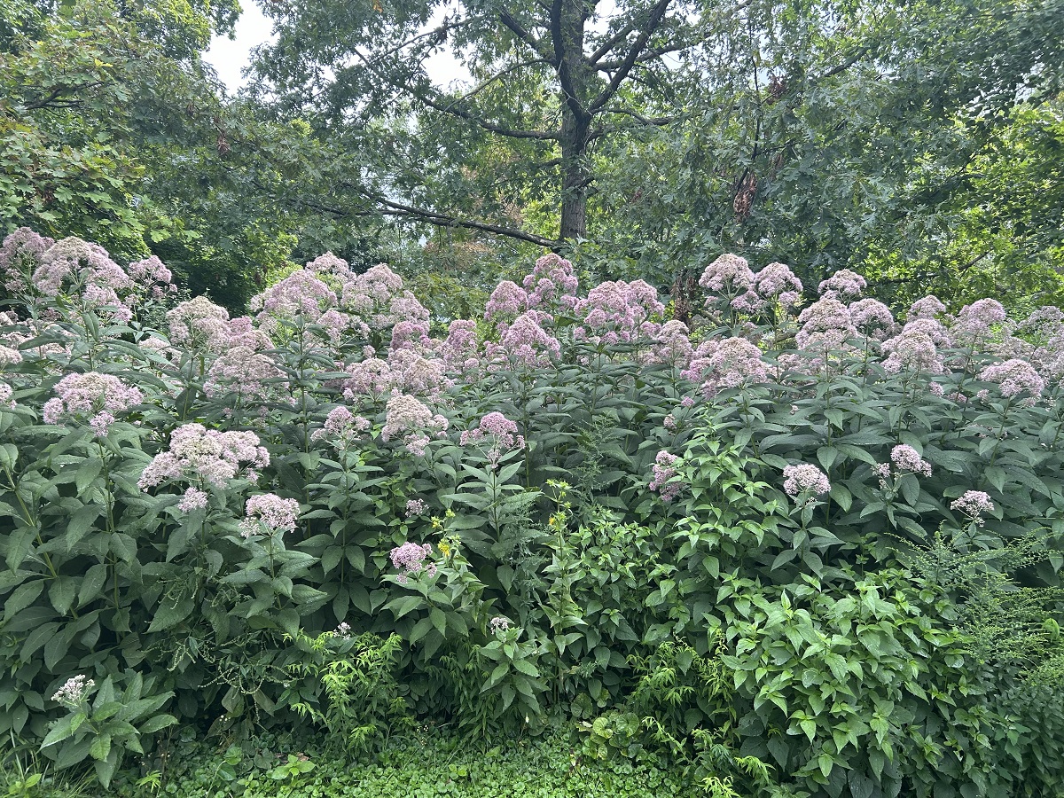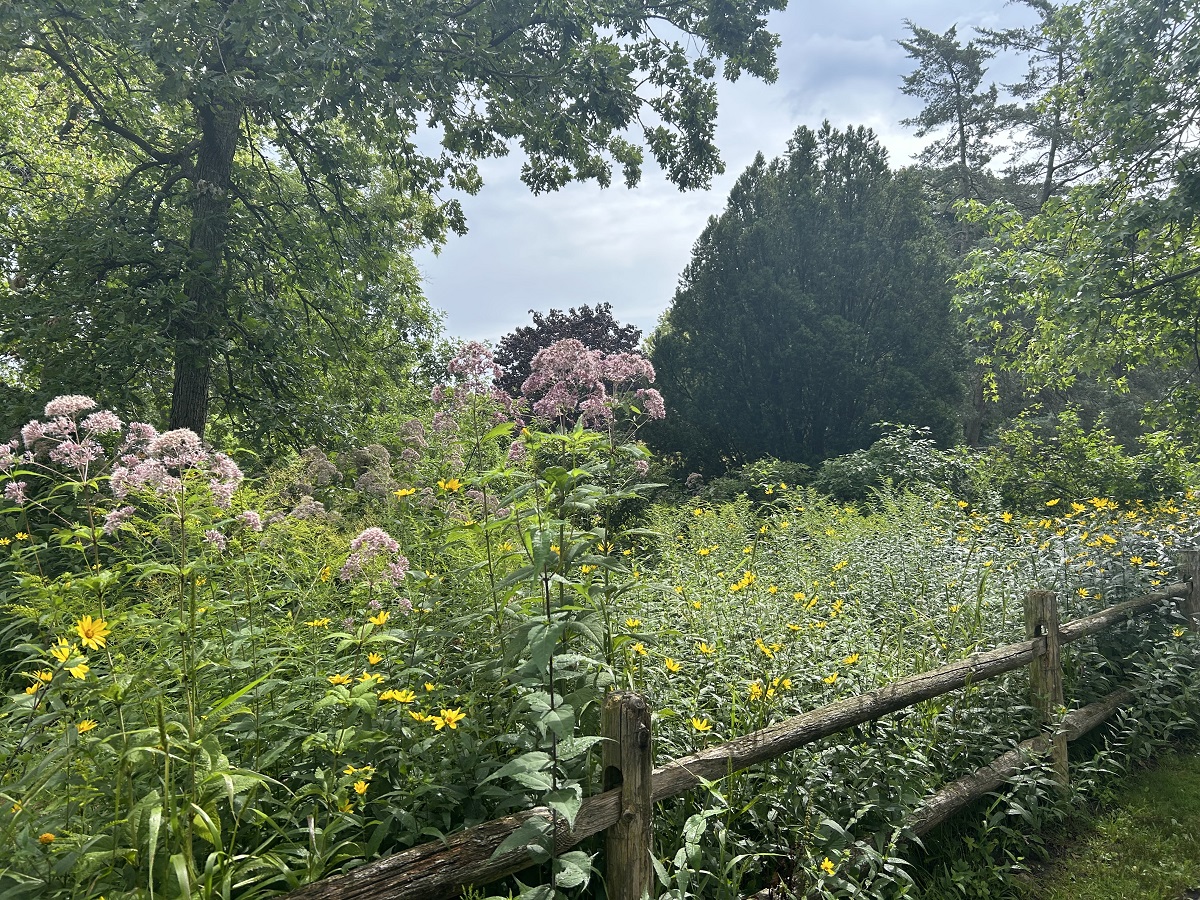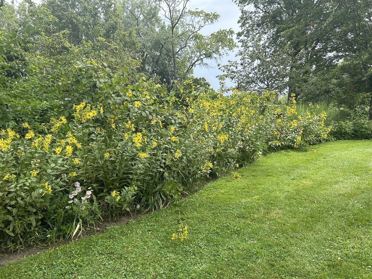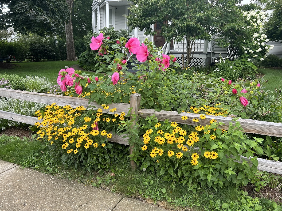 Many black eyed susans with huge dark pink flowers above them on Sheridan Road