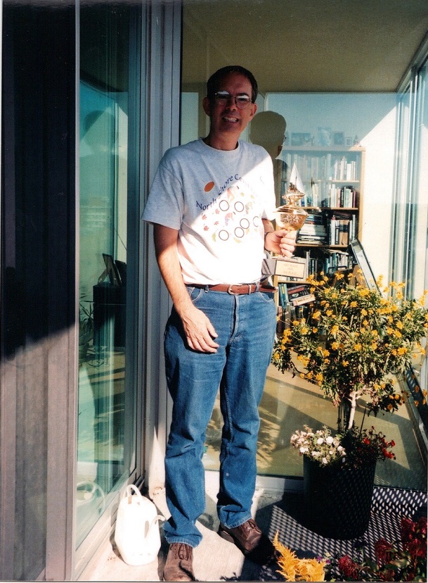 Andy with Art McGee trophy showing flowers on his condo balcony