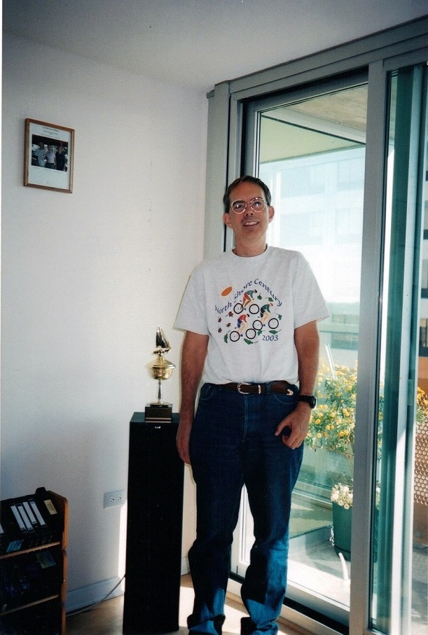 Andy holding Art McGee trophy with flowers on his condo balcony