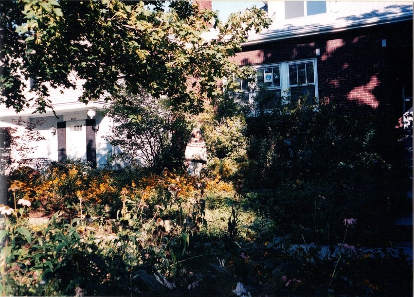 Marjorie with flowers (black eyed susans) at her house showing "Pesticide Free Zone" sign