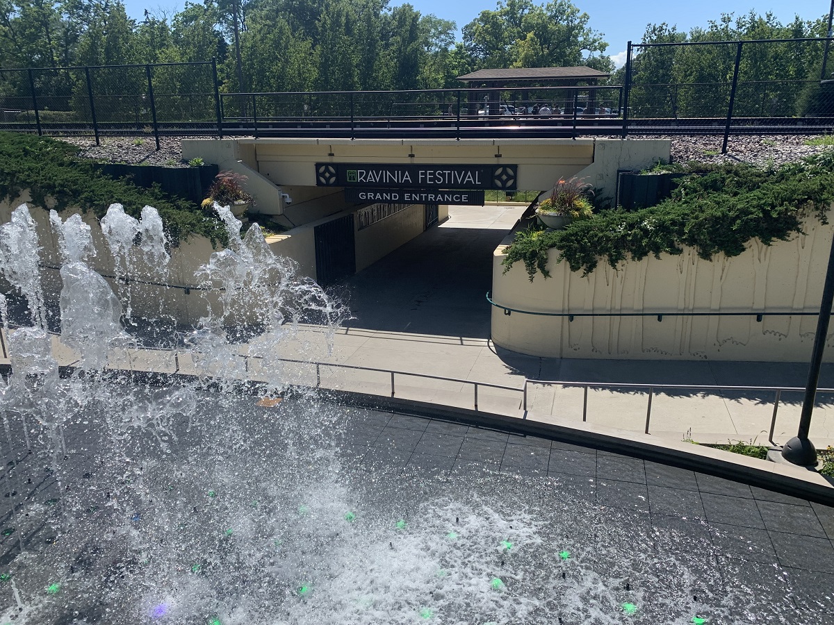 New gate to Ravinia Festival with fountain under Metra tracks lookiing west