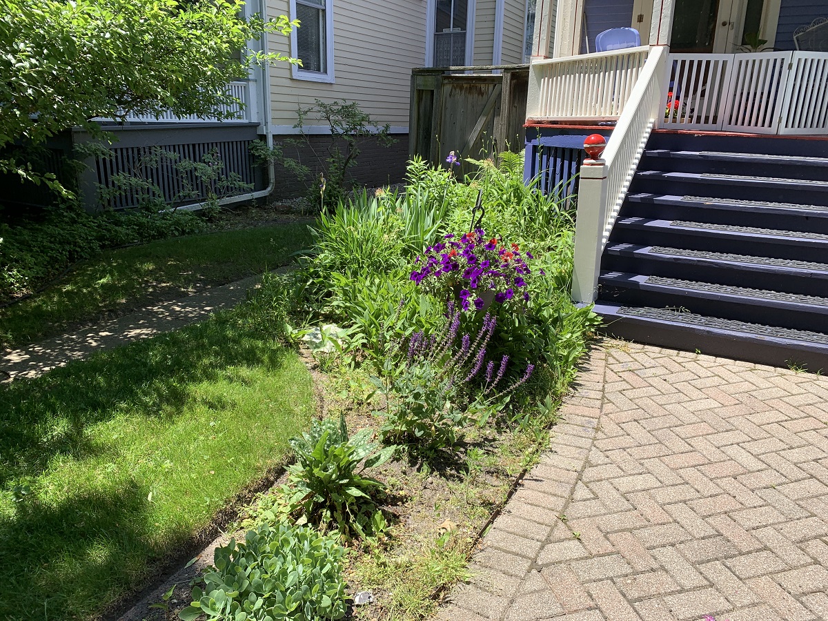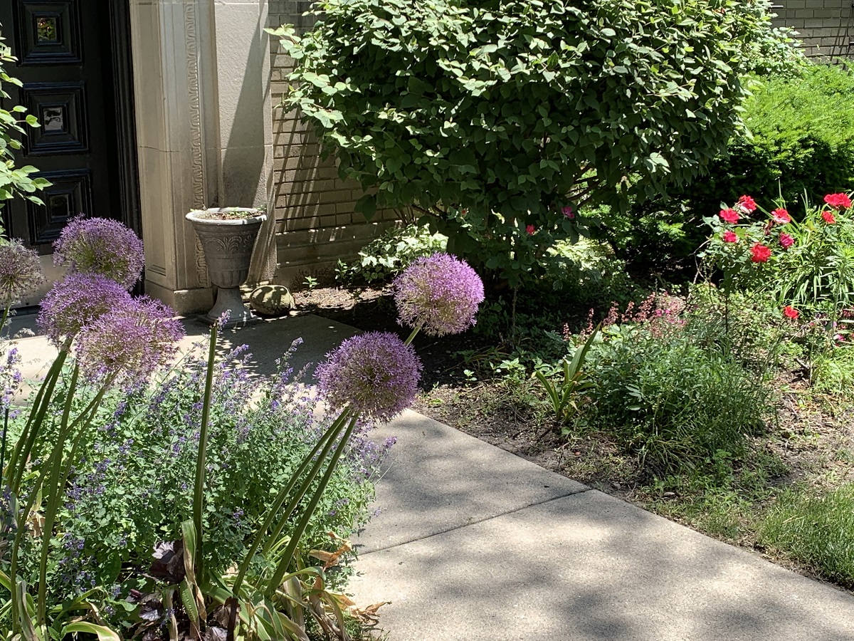 Many low purple flowers with red roses in back at hospital