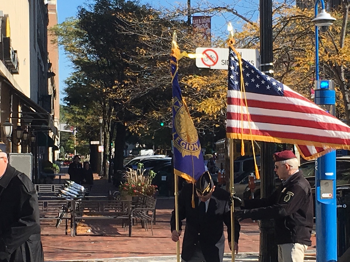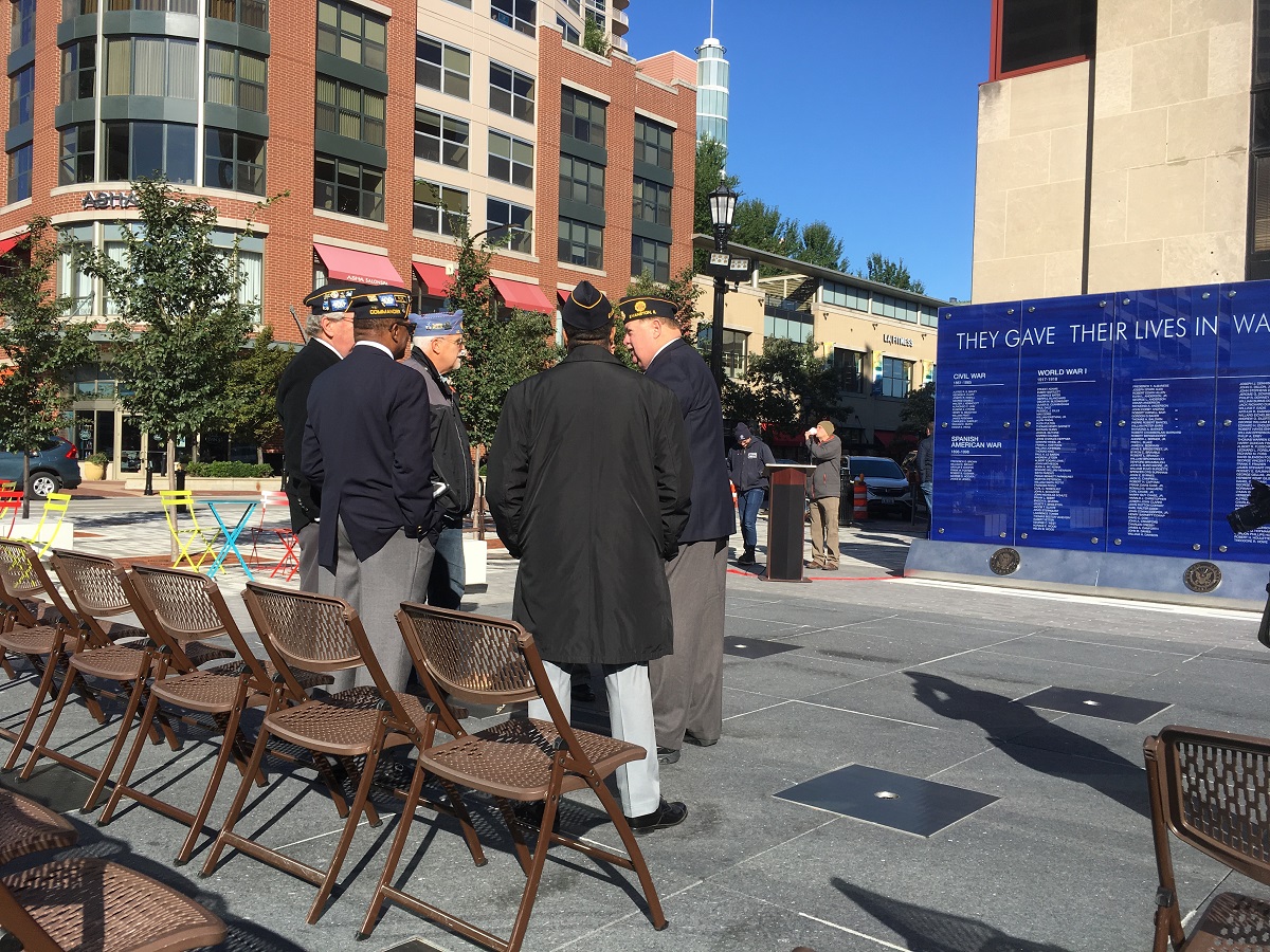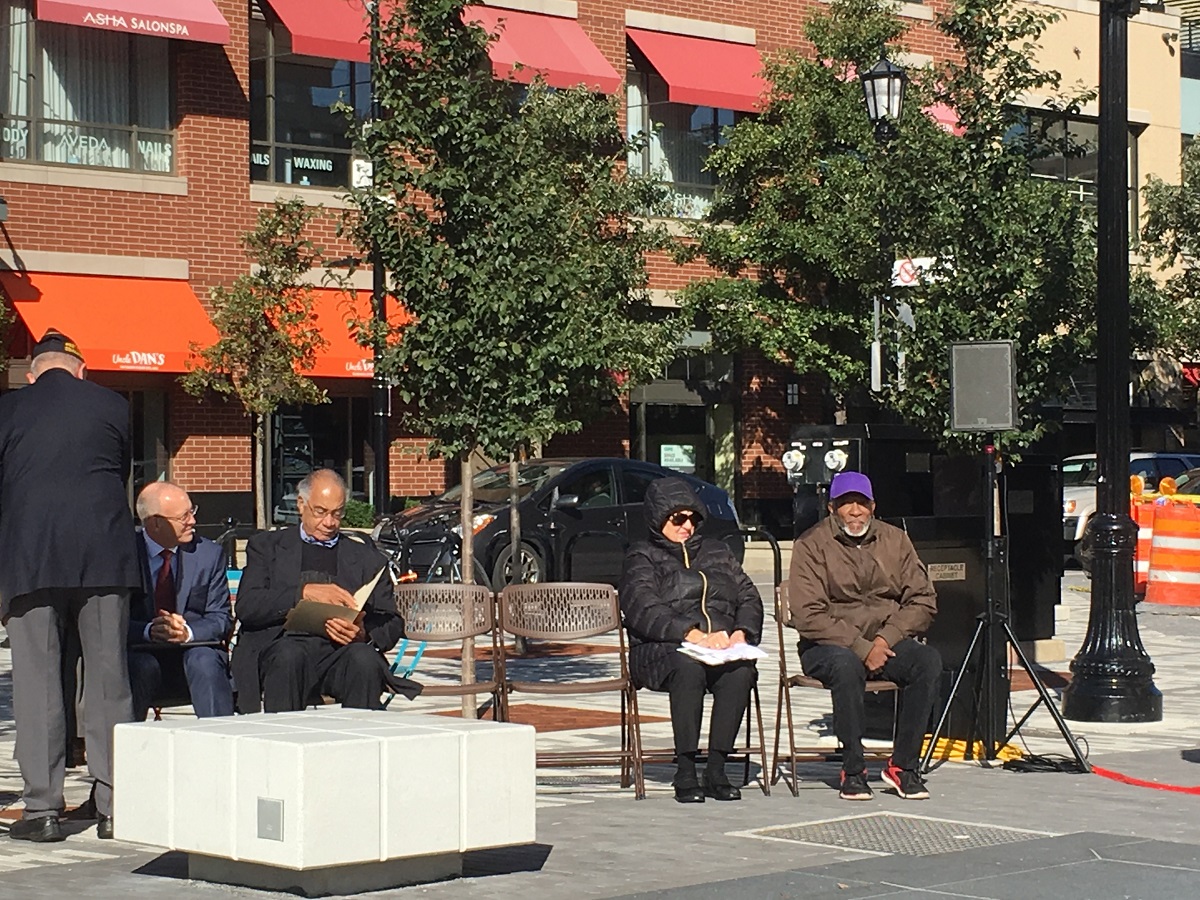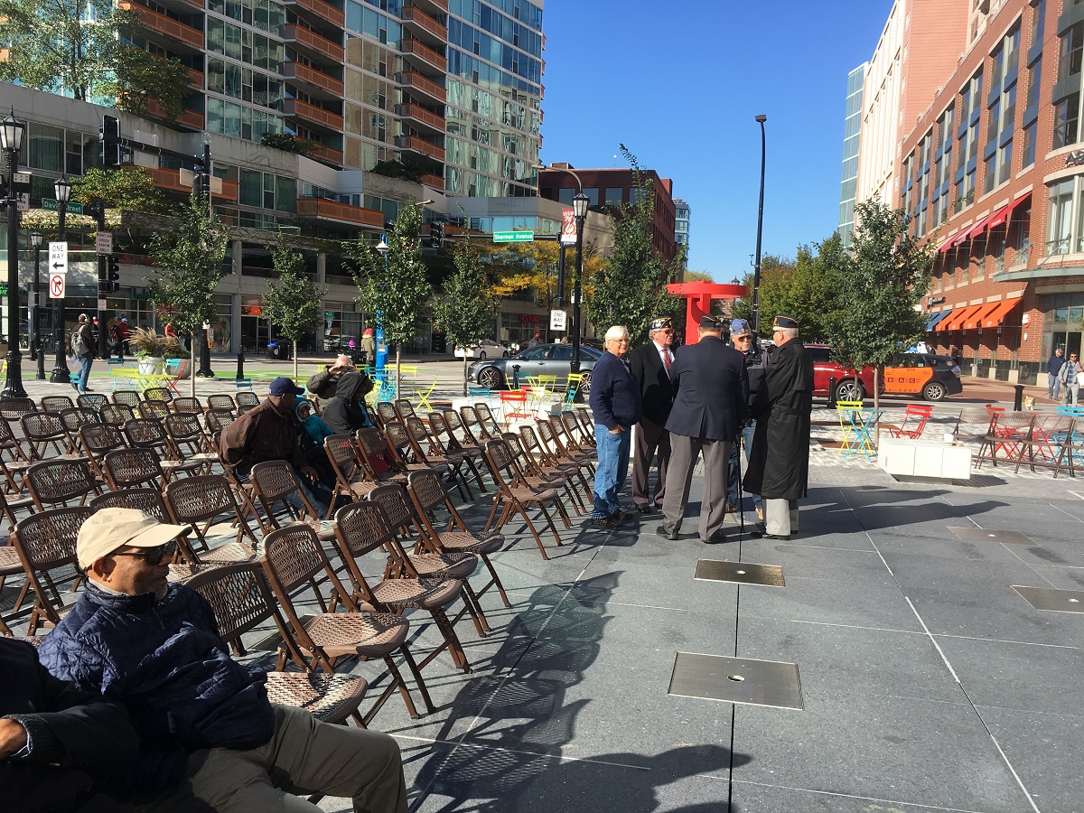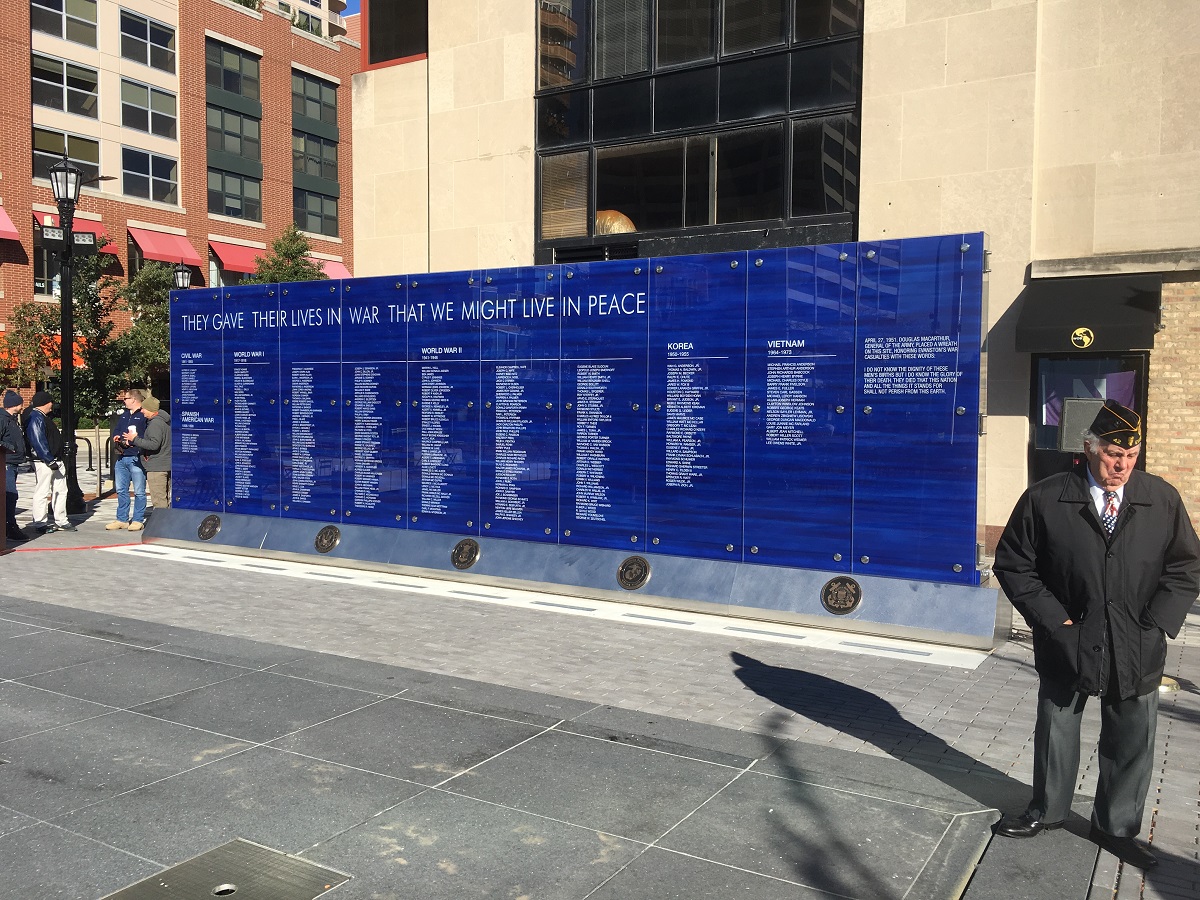 Fountain Square memorial wall with Evanston Soldier -- October 13, 2018