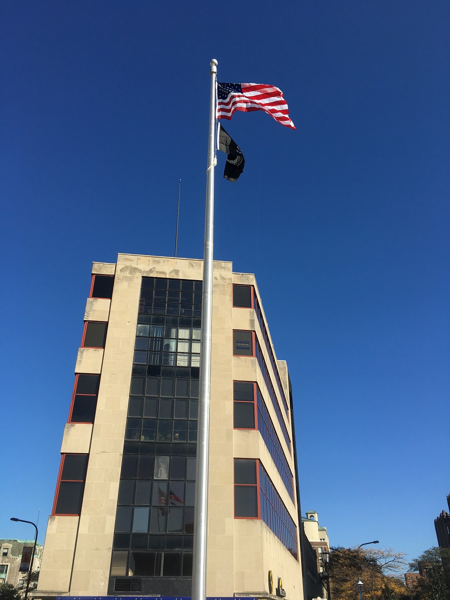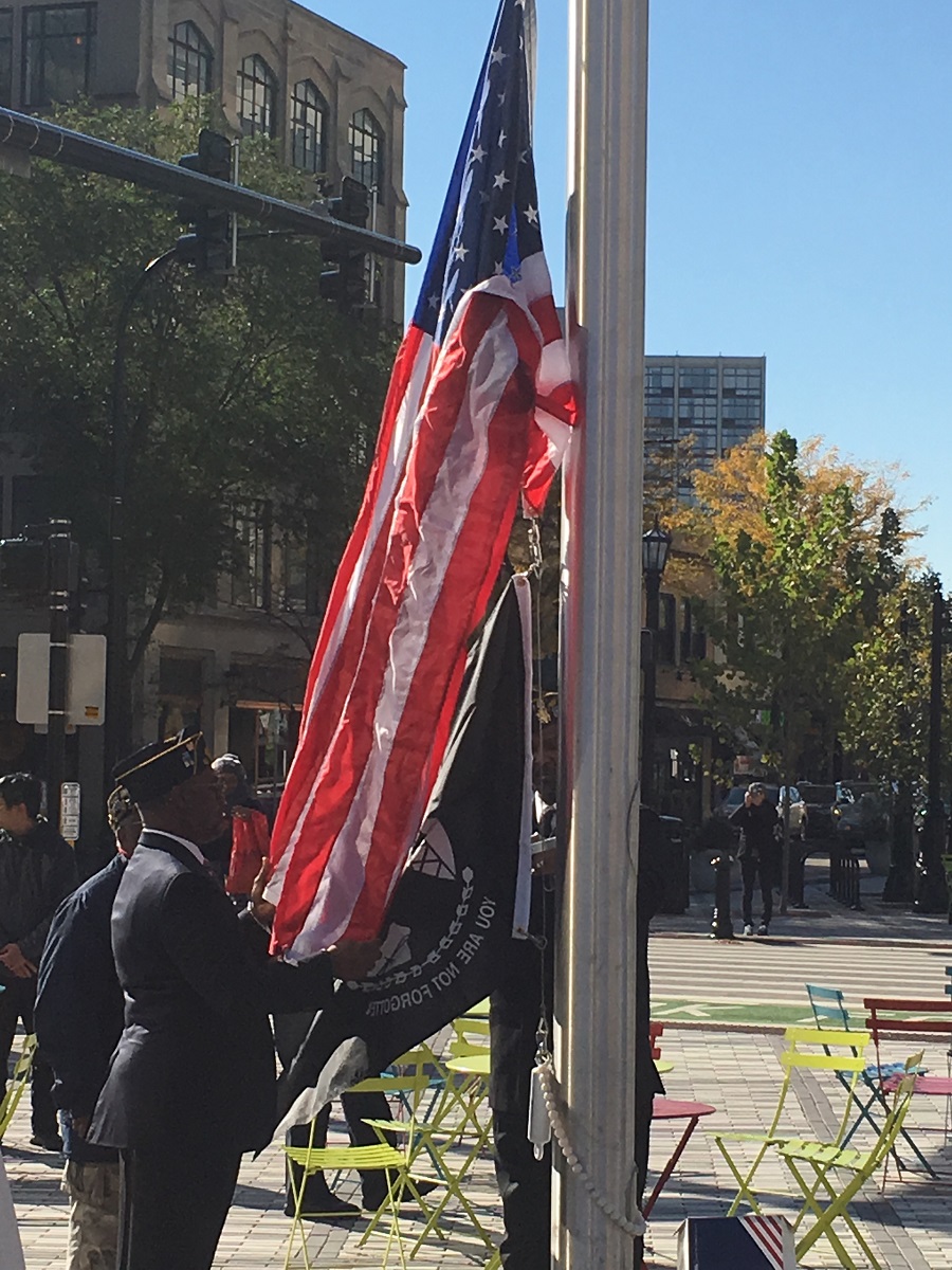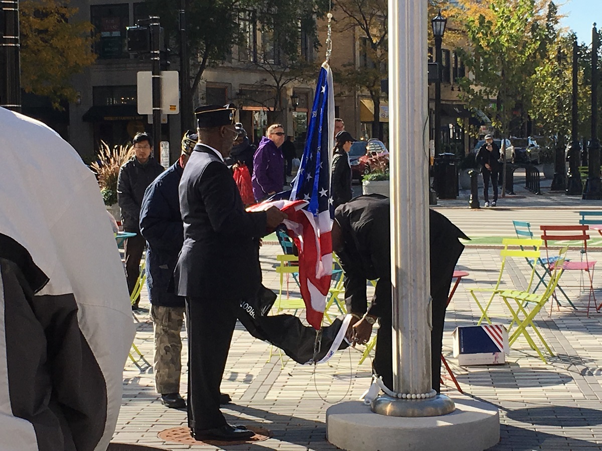 Flags raising for the first time at Fountain Square