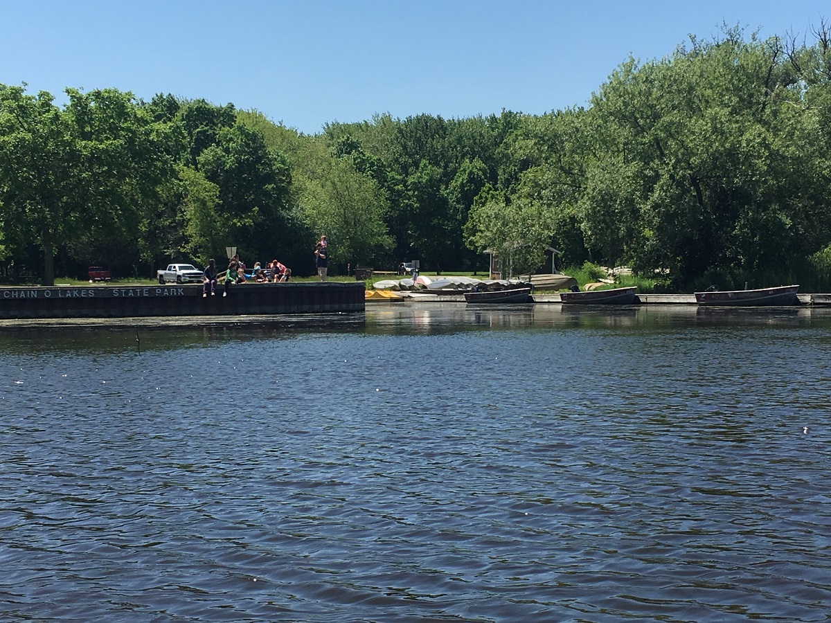 "Chain O Lakes State Park" sign with many young people