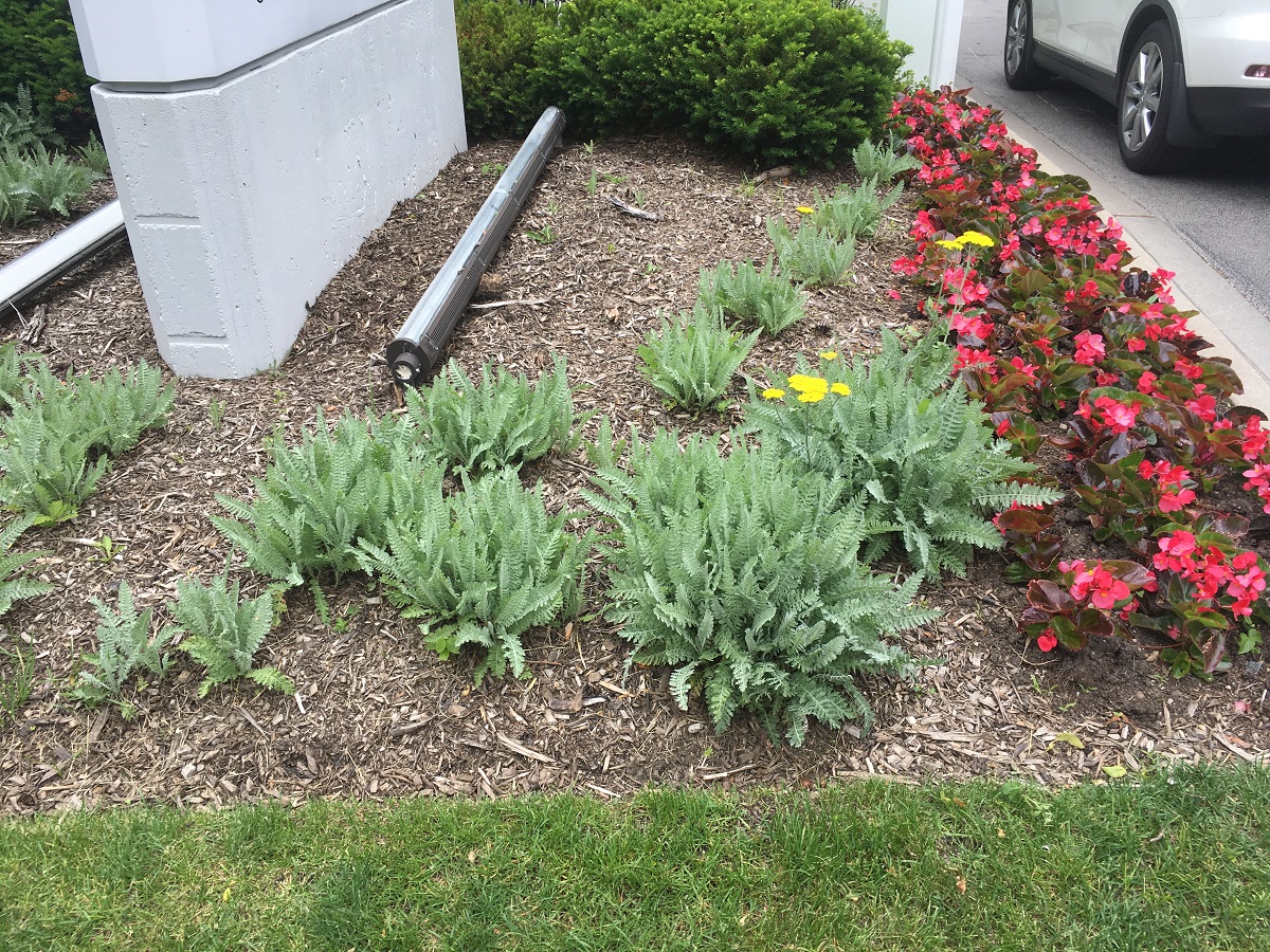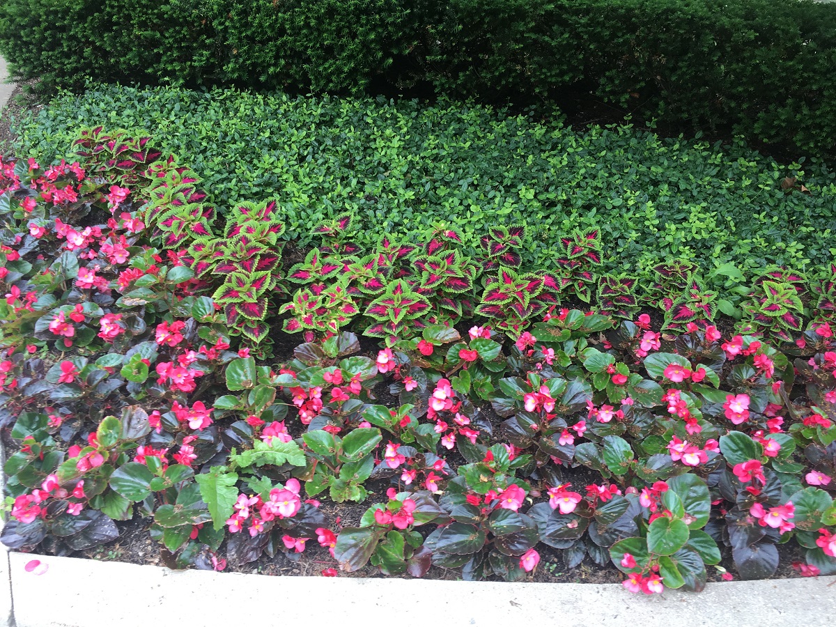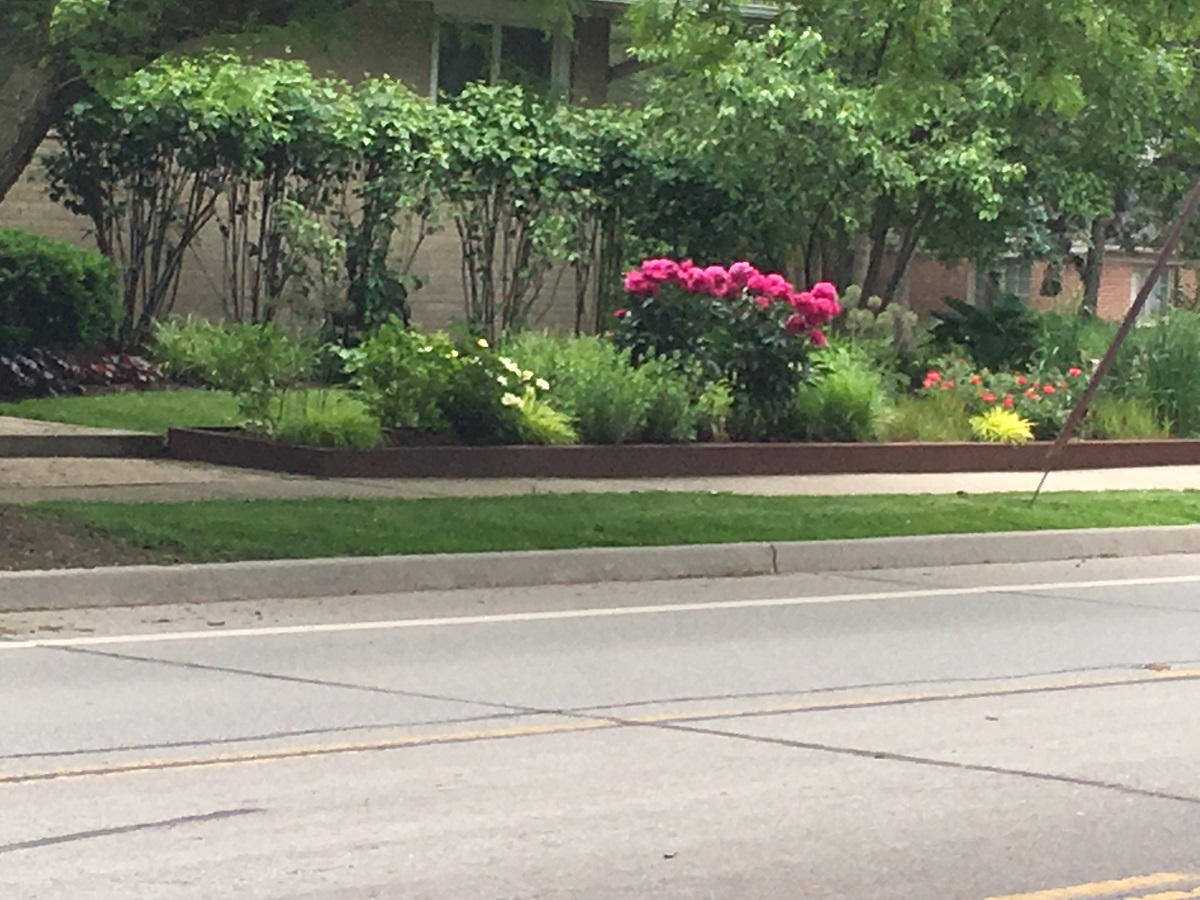 Red flowers and purple colius on Ridge Avenue by main entrance to Evanston Hospital