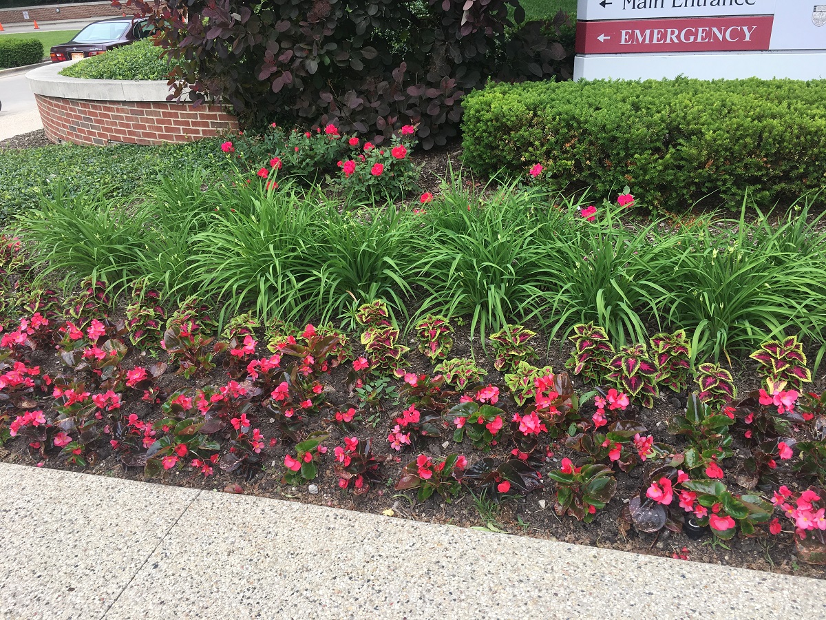 Red flowers on Ridge Avenue by main entrance to Evanston Hospital