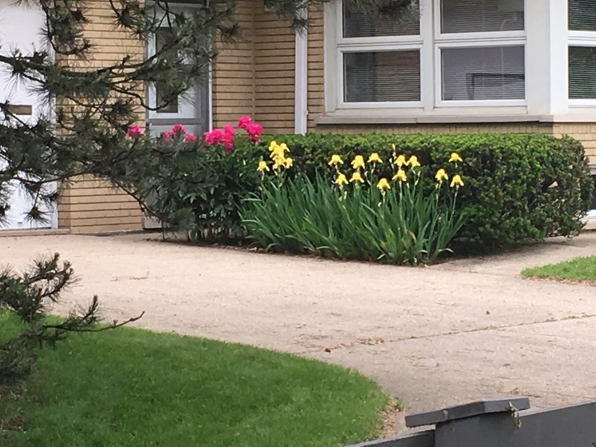 Red roses and yellow iris on Central St. just east of Ridge