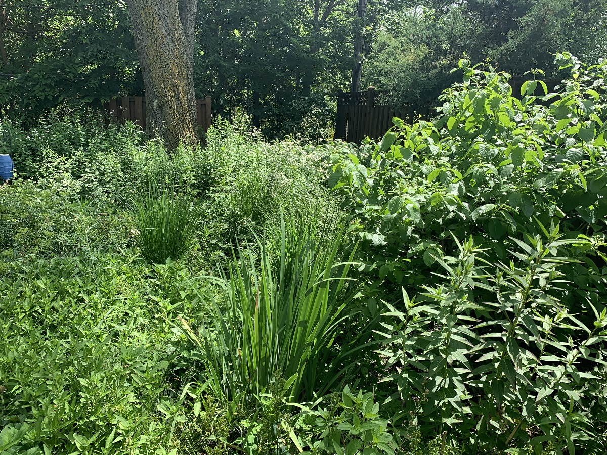 Two downspouts to properly slowly water the rain garden in back -- In most rains there is a minimum of water escaping to the storm sewers