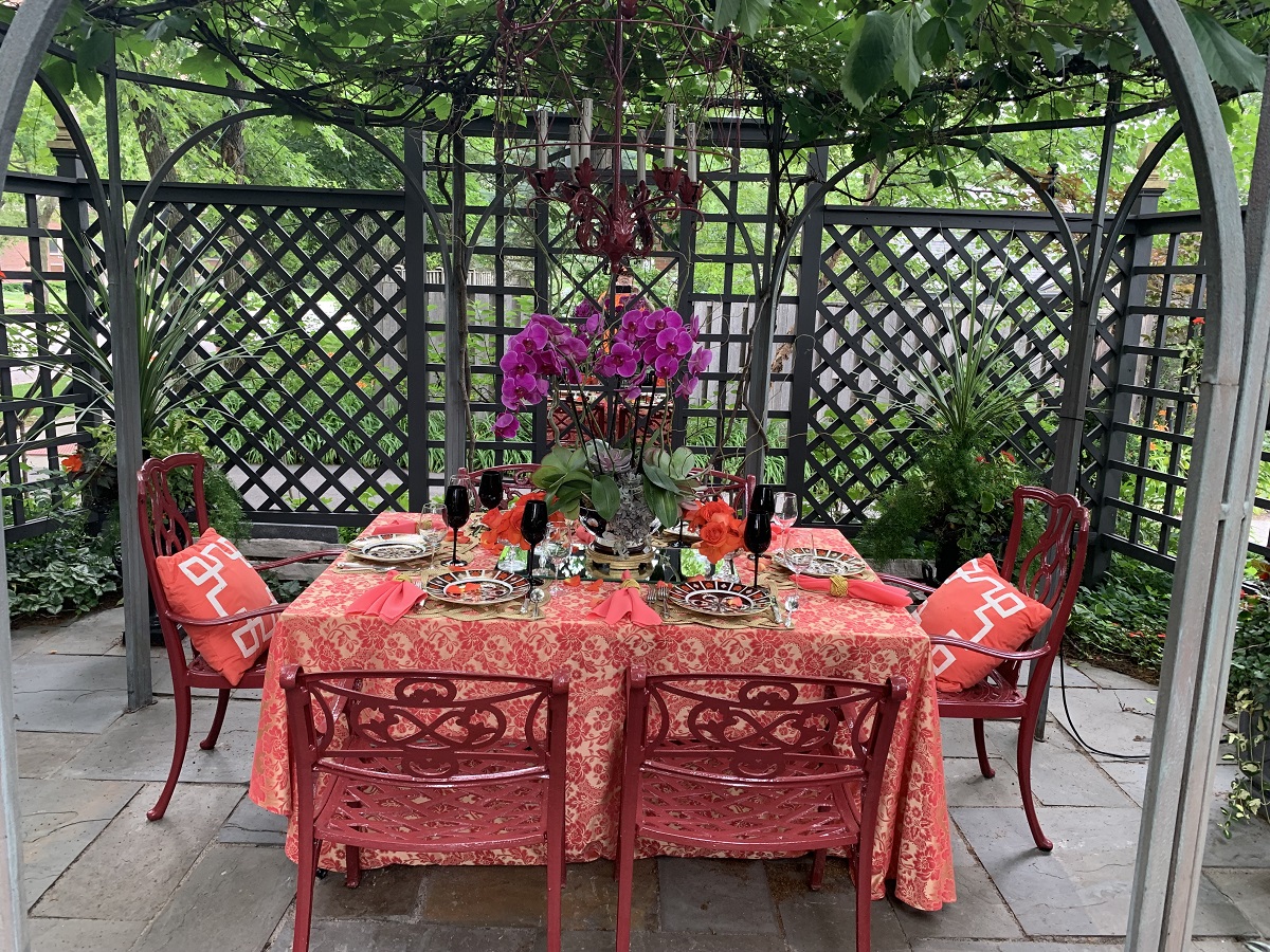 Gazeebo with orange table ready for a meal -- nice purple flowers