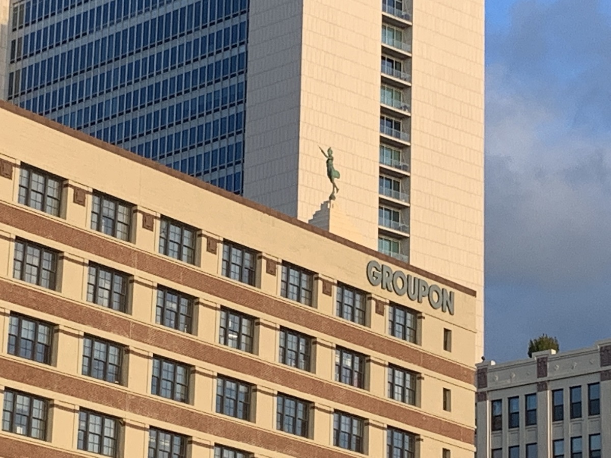 Green lady statue on tip of building by GROUPON