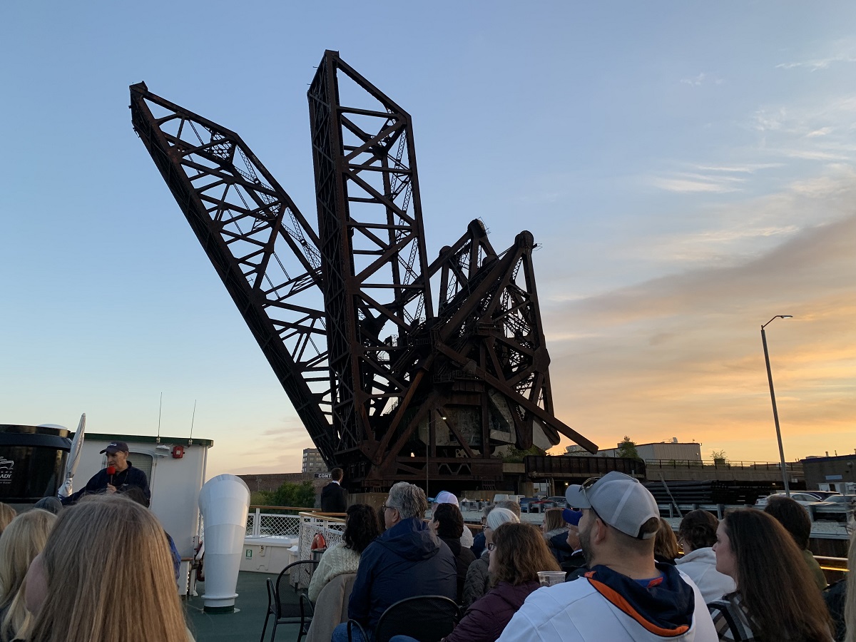 Huge vertical lift bridge for railway that crosses river at an angle! -- as far south as we went