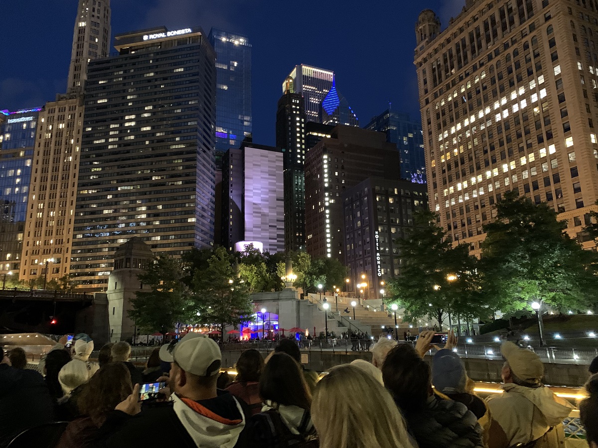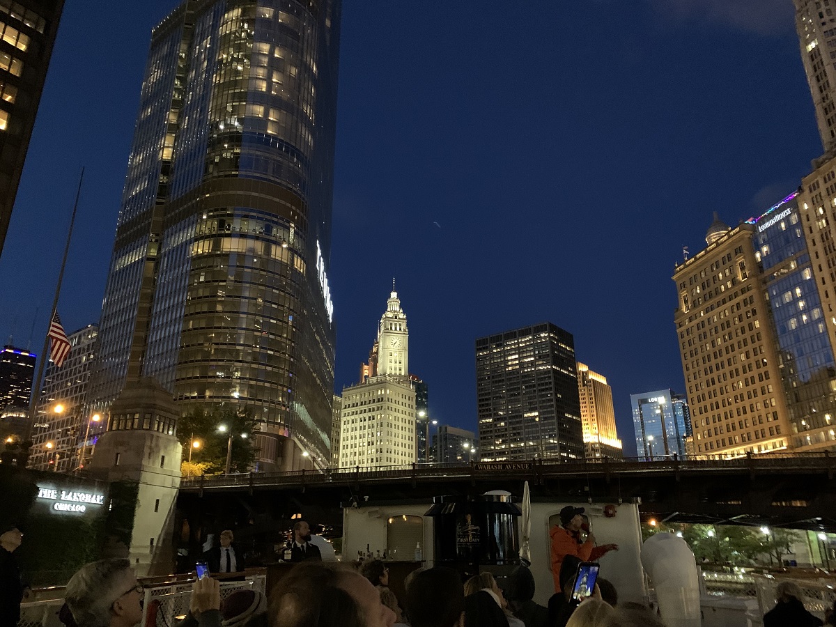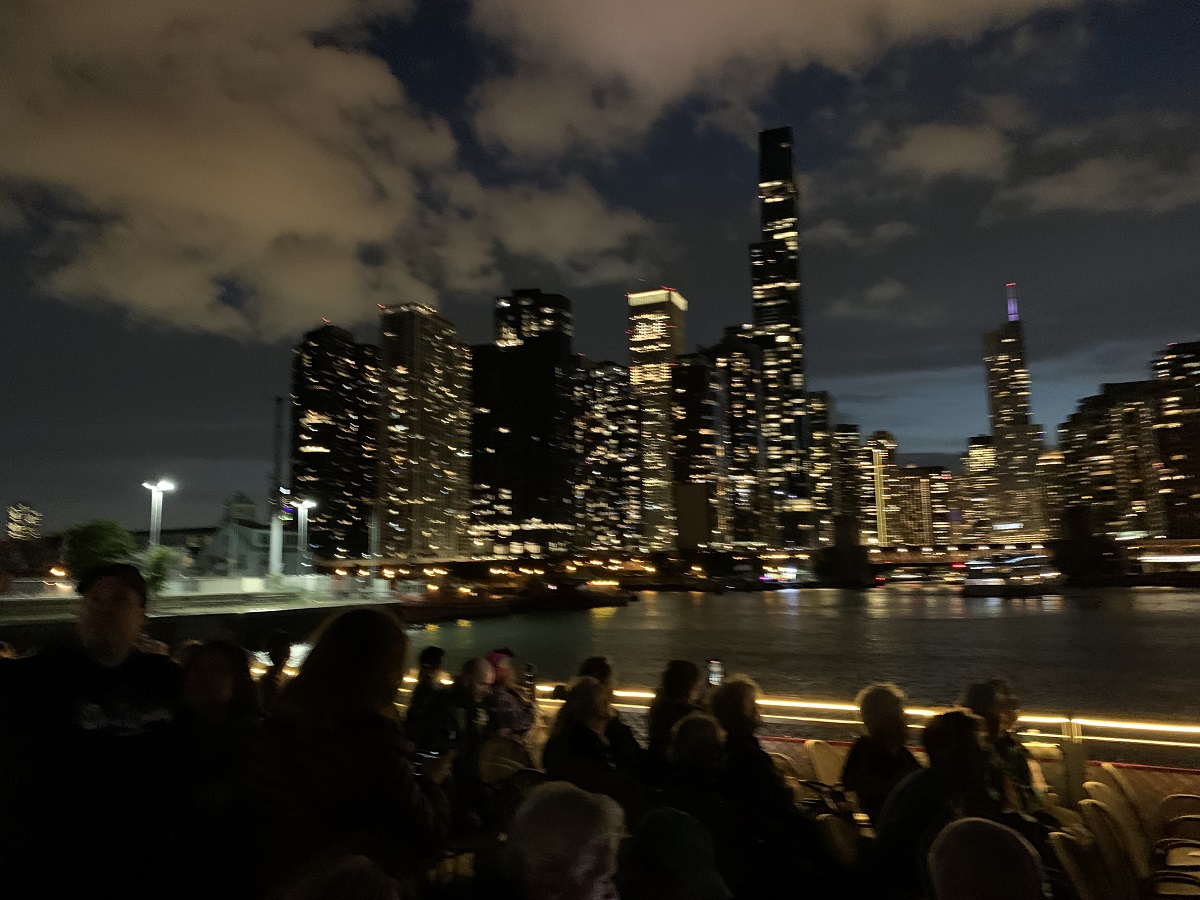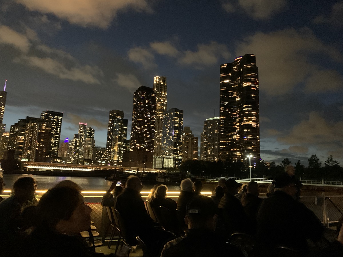 Lit Chicago skylione to the northwest showing Lake Point Tower