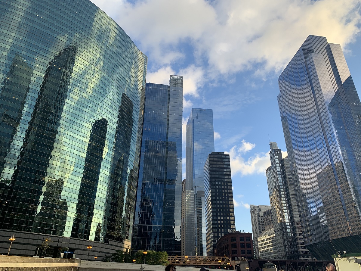 Tall condo and others waining to board boat south bank of Chicago River just east of Michigan Avenue