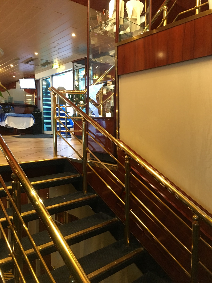 More golden rails leading up to the main lounge and desk area