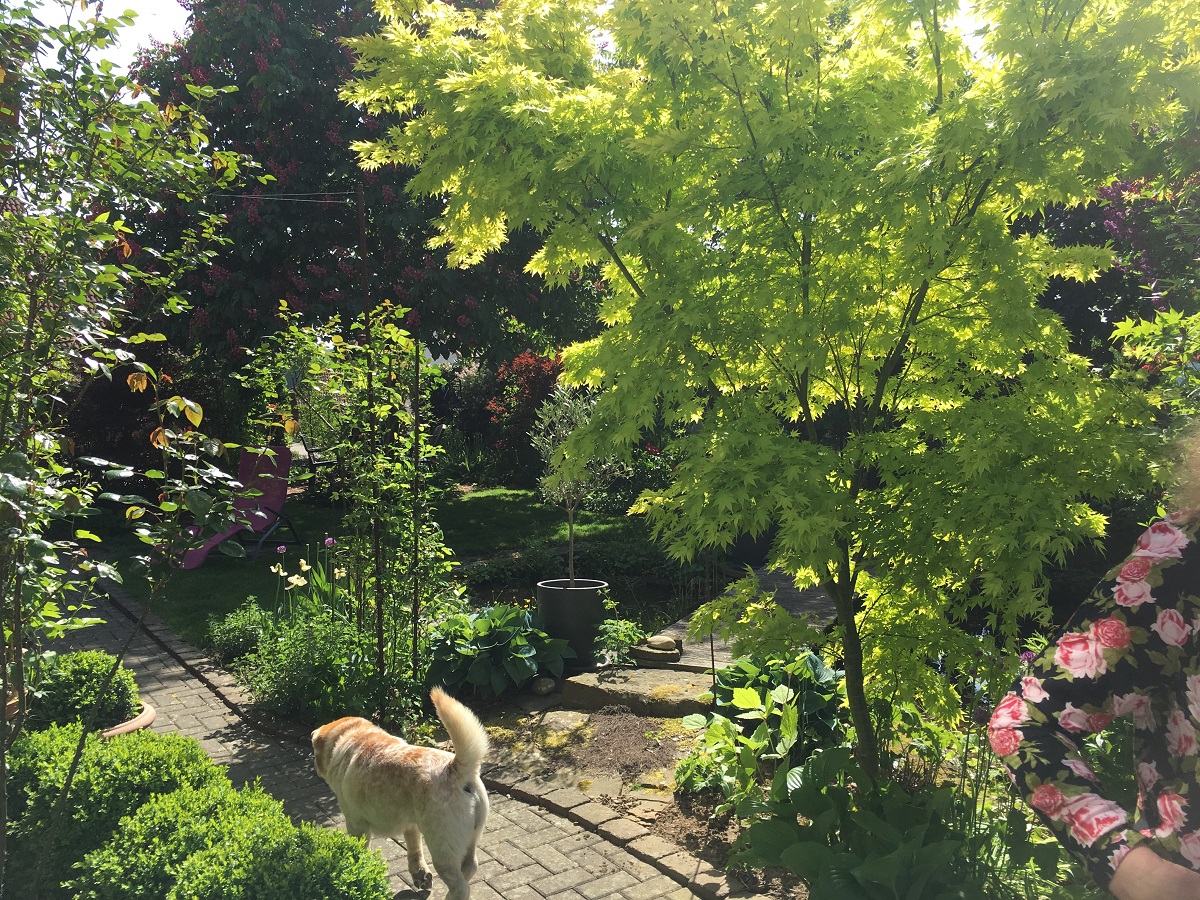 Their dog walks through their beautiful home garden