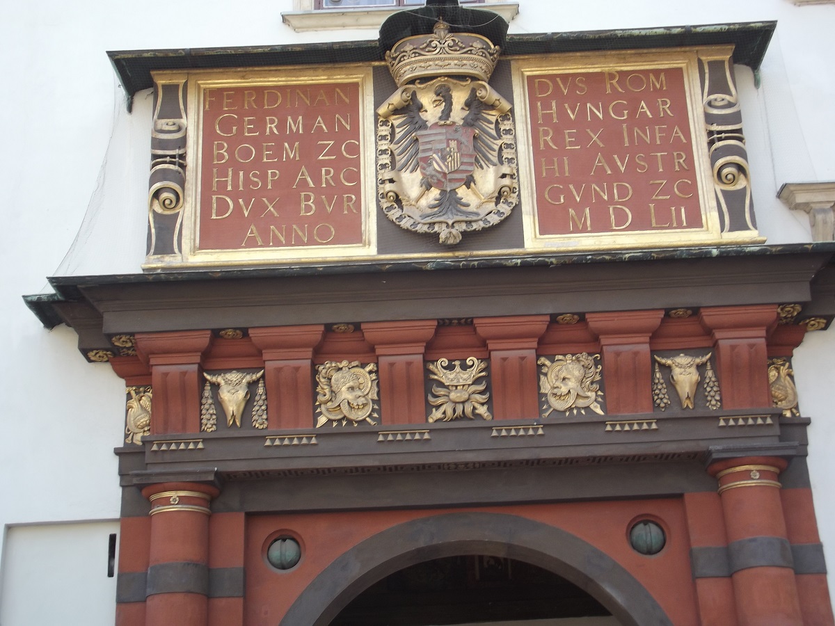 Text and seals over arch