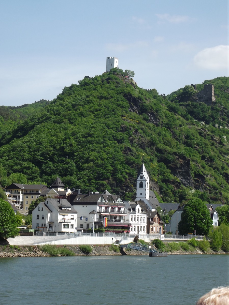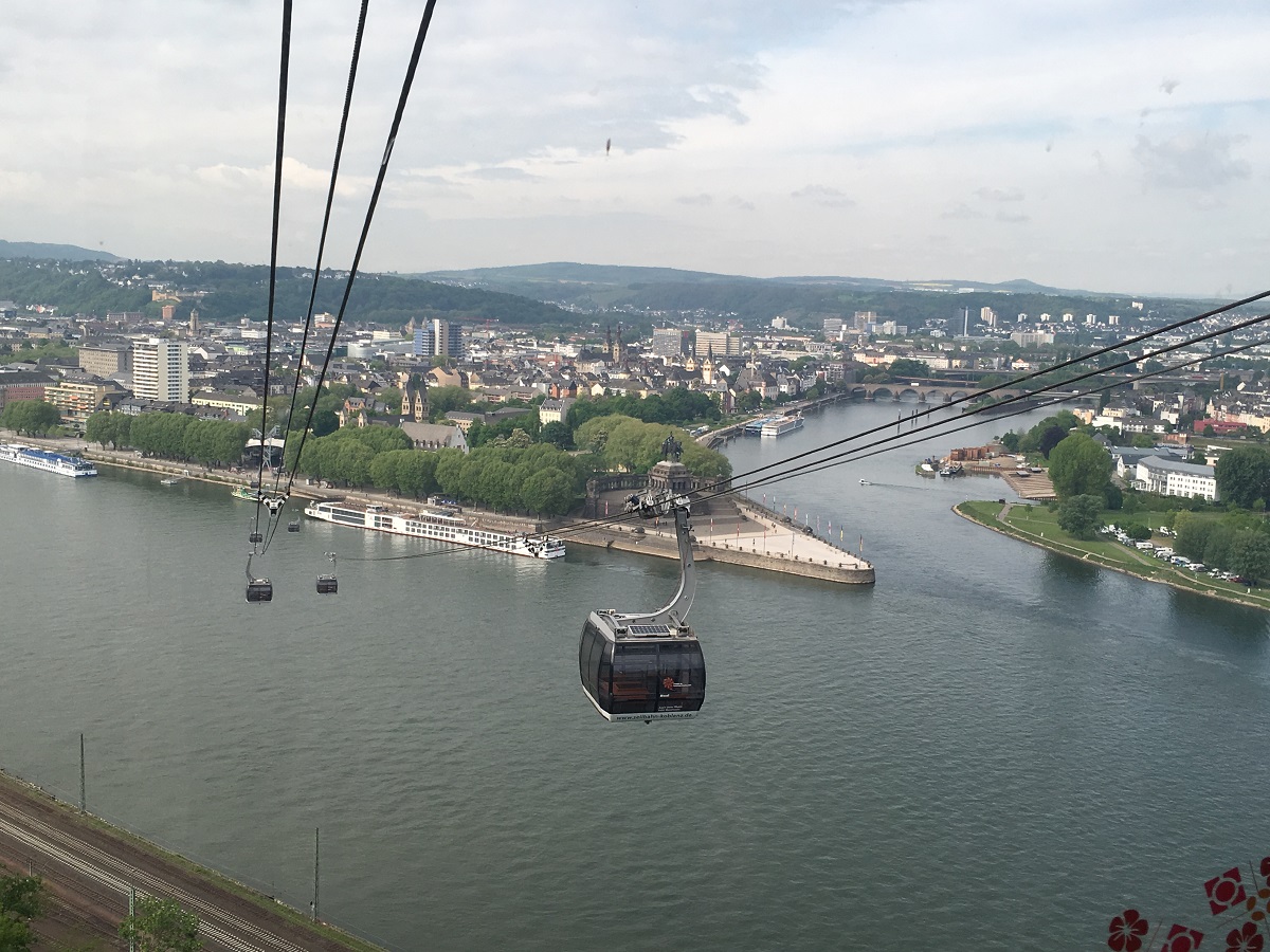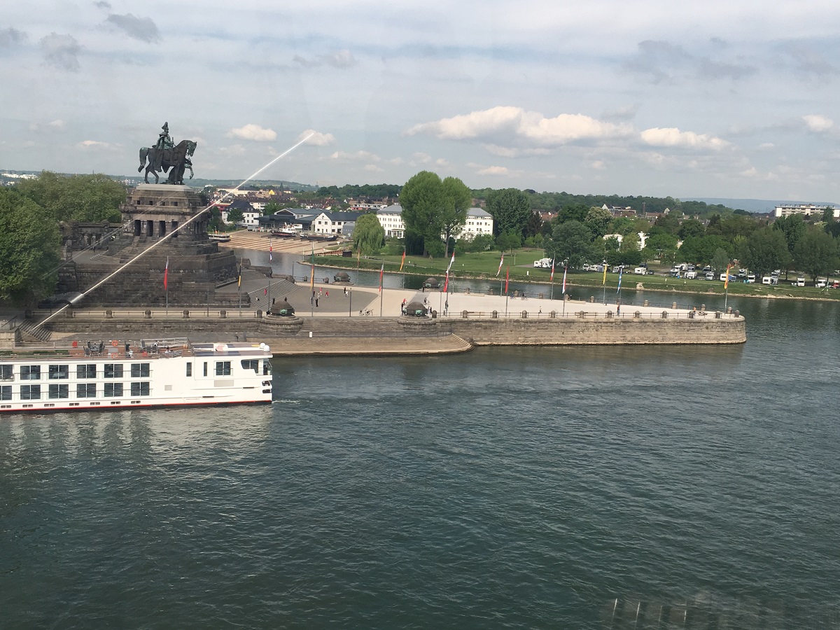 Gondola showing both the Moselle and the Rhine rivers -- our ship, River Harmony, is to the left of the gondola cables