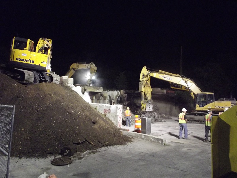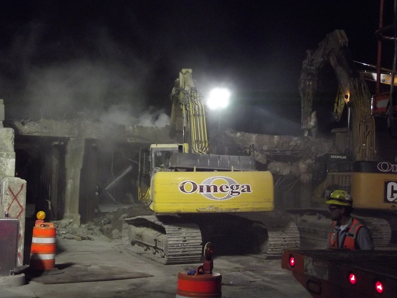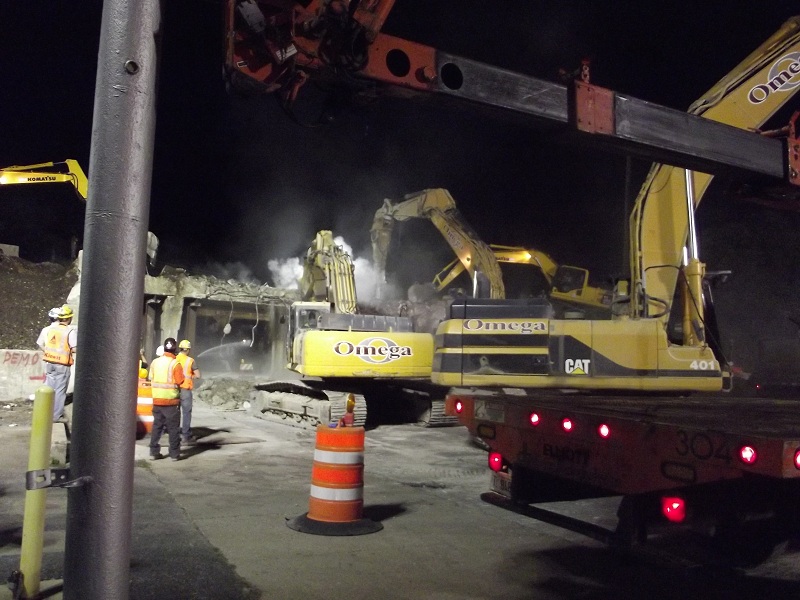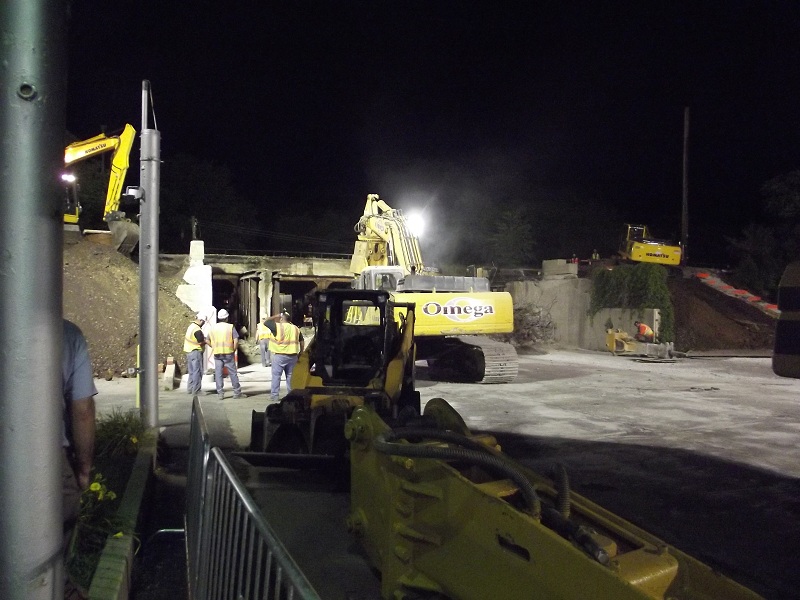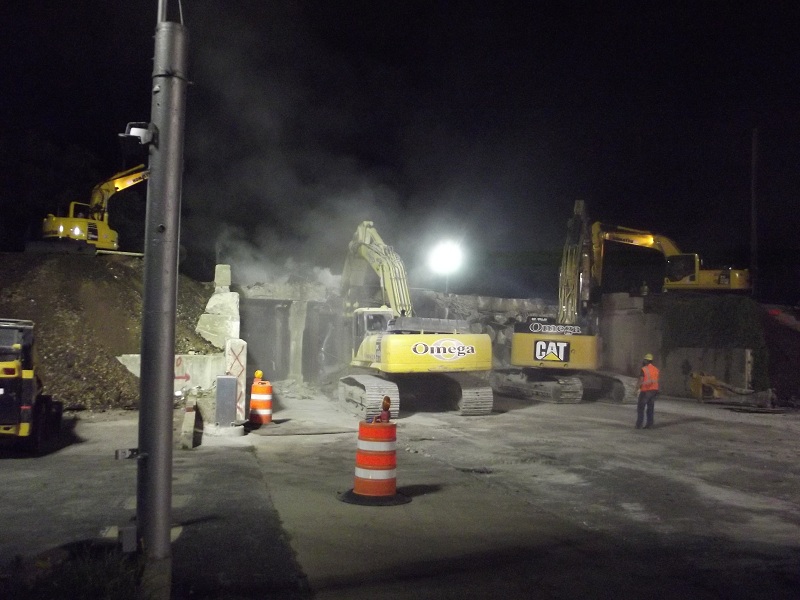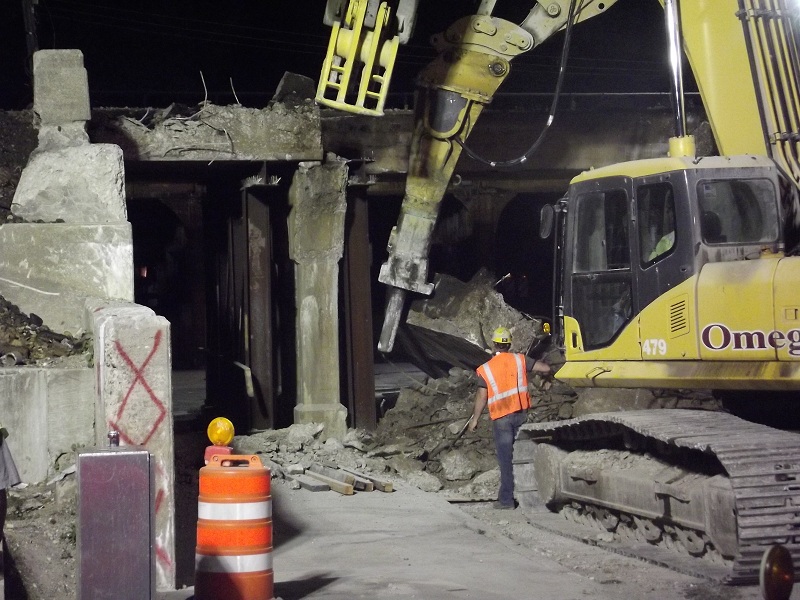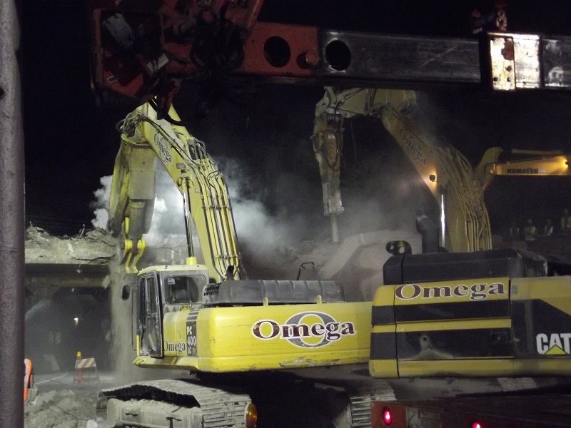 Further progress in demolition of old contrete viaduct -- the jack hammer on right has already made it halfway through the concrete viaduct