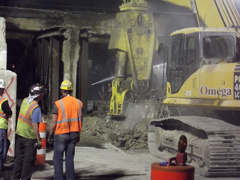 Further progress in demolition of old contrete viaduct -- worker with hose to minimize dust shows clearly under span just to left of "Omega" on jaws machine