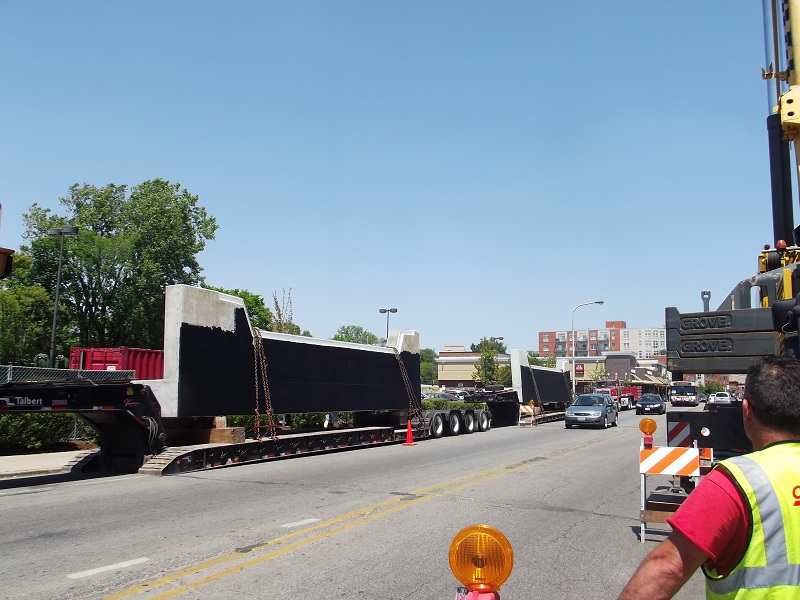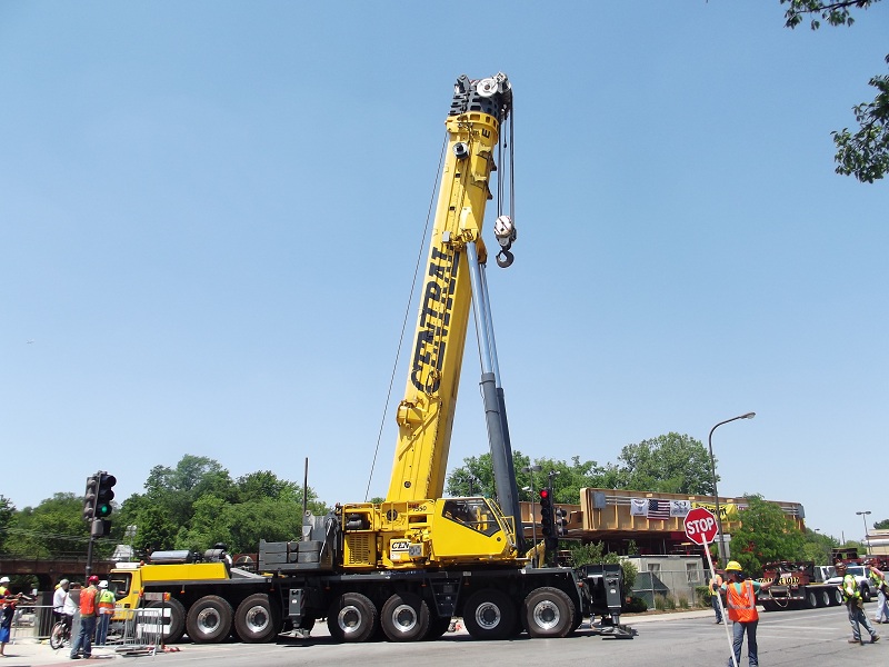 Moving heavy duty crane accross Chicago Avenue into Greenleaf next to viaduct