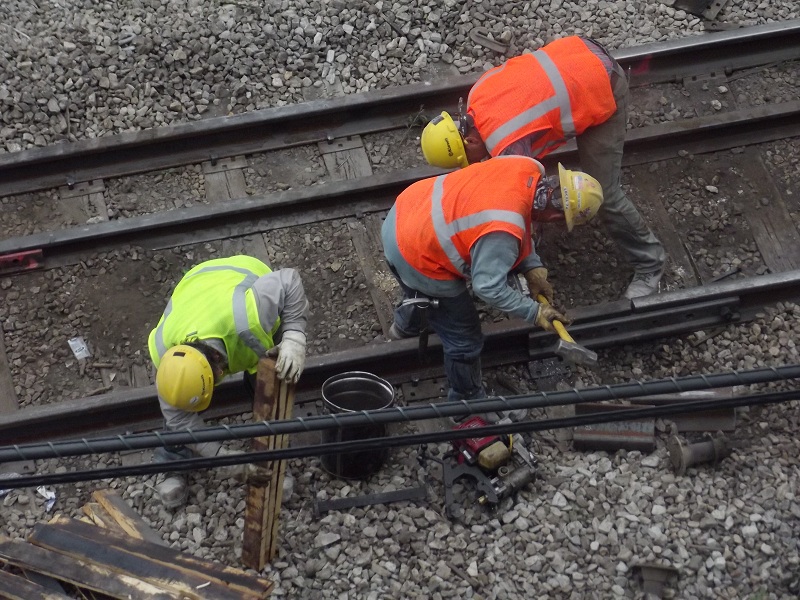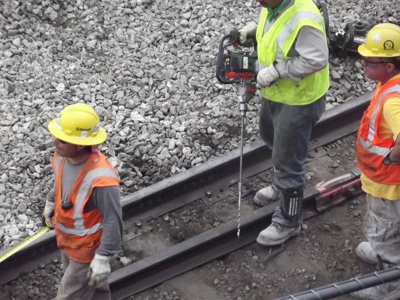 Workers drilling a horizontal hole through track for fastener just north of Grove street bridge