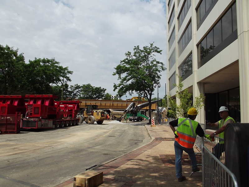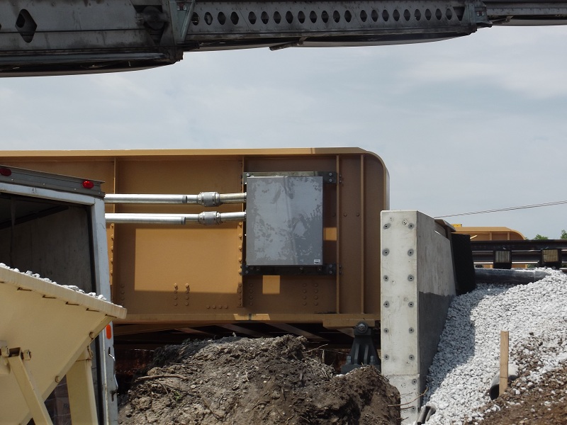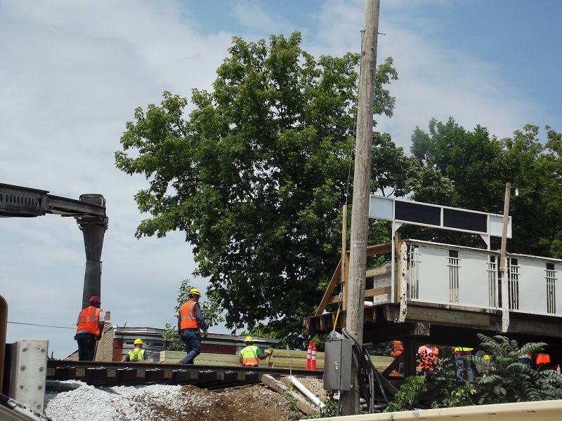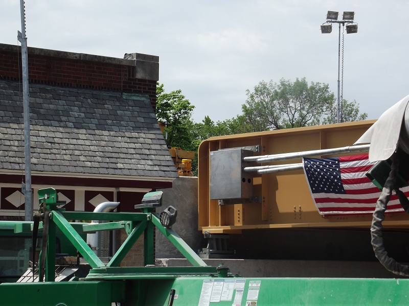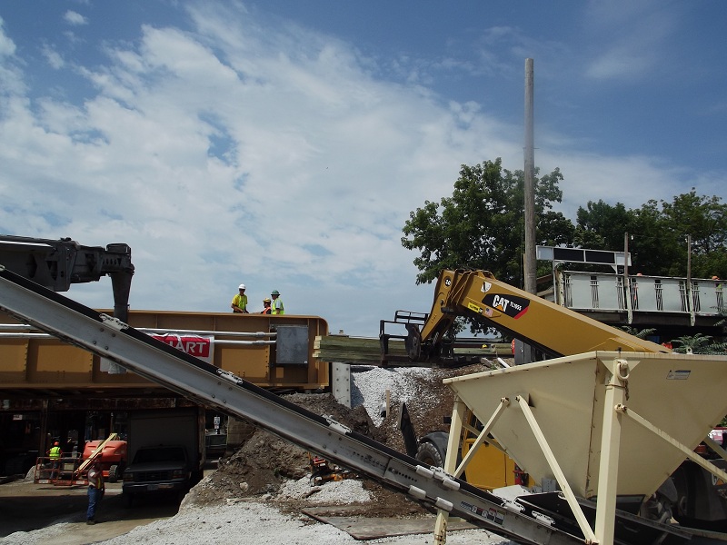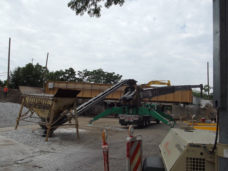 Grove street bridge in place with gravel ballest being fed by a complex, varriable conveyor system