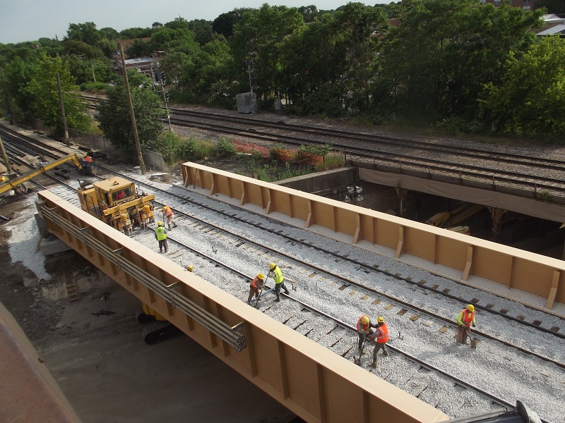 Grove street bridge in place with gravel ballest being fed by a complex, varriable conveyor system