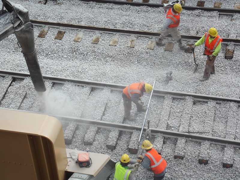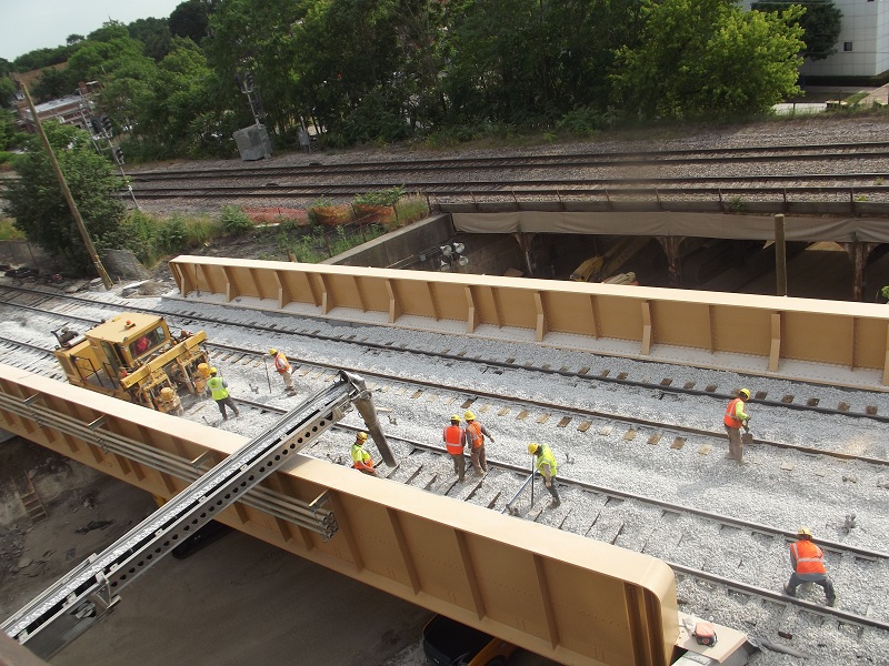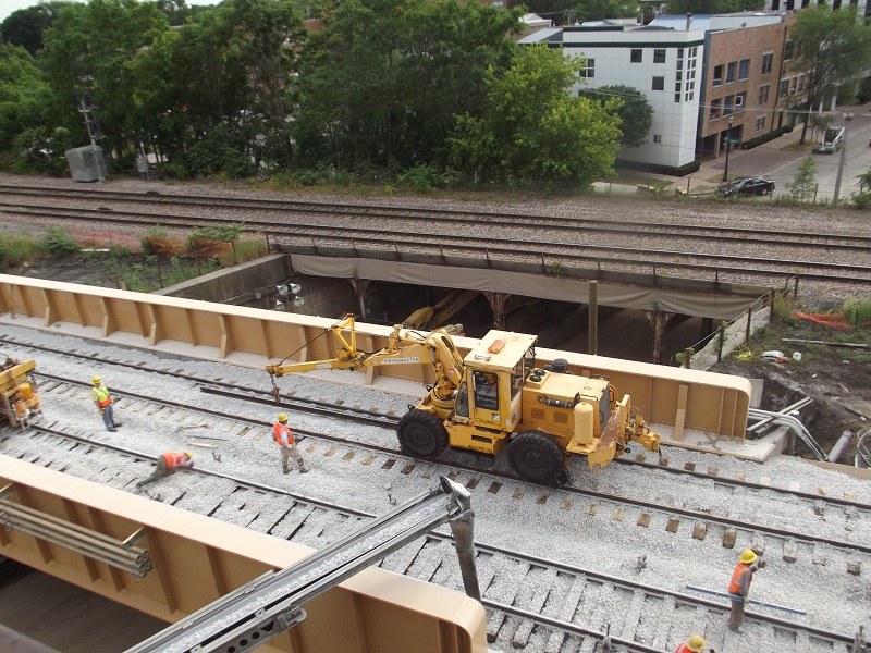 Rail derrick and tie & ballast leveler machines on Grove street bridge