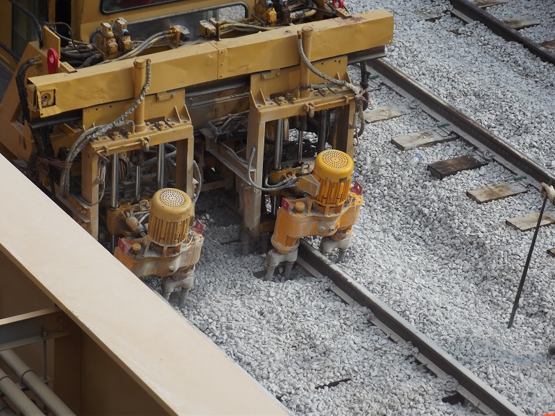 Close view of complex machine to force gravel under rail ties while maintaining a level track on Grove street bridge