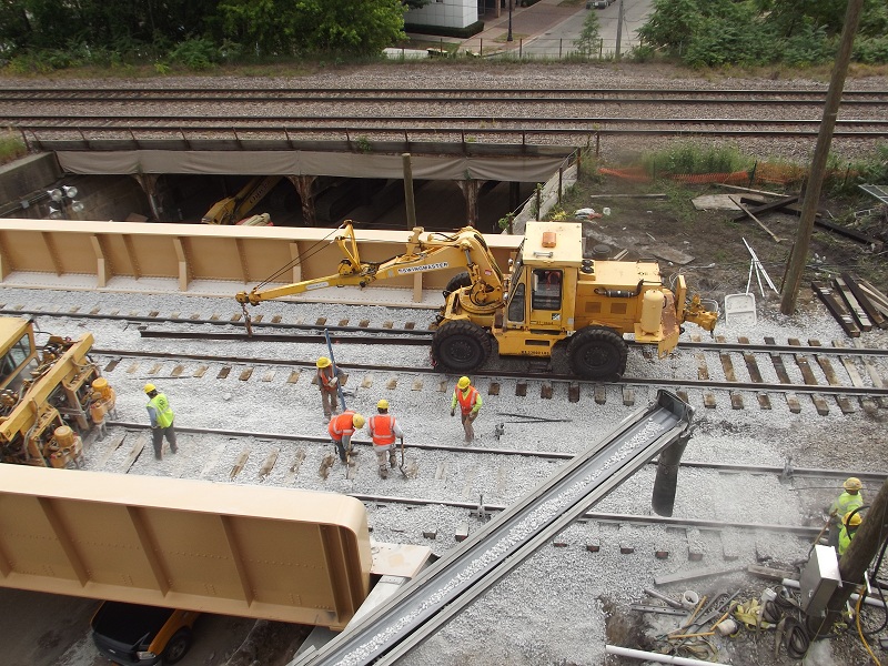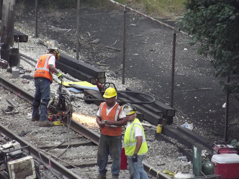 Worker grinding sides of rails to ensure proper alignment just south of Grove street bridge