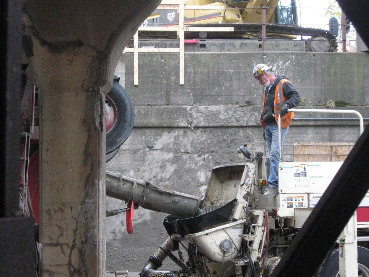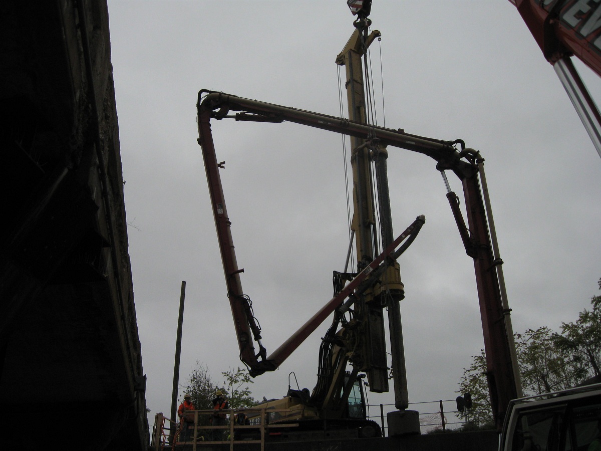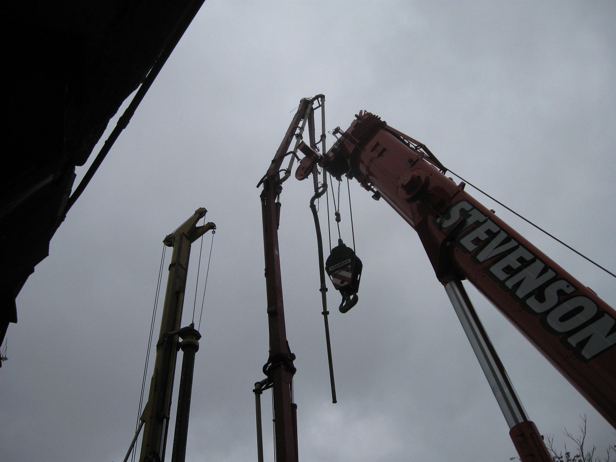 The combined 80 foot cage is being lowered while the concrete pump is slowly being raised.