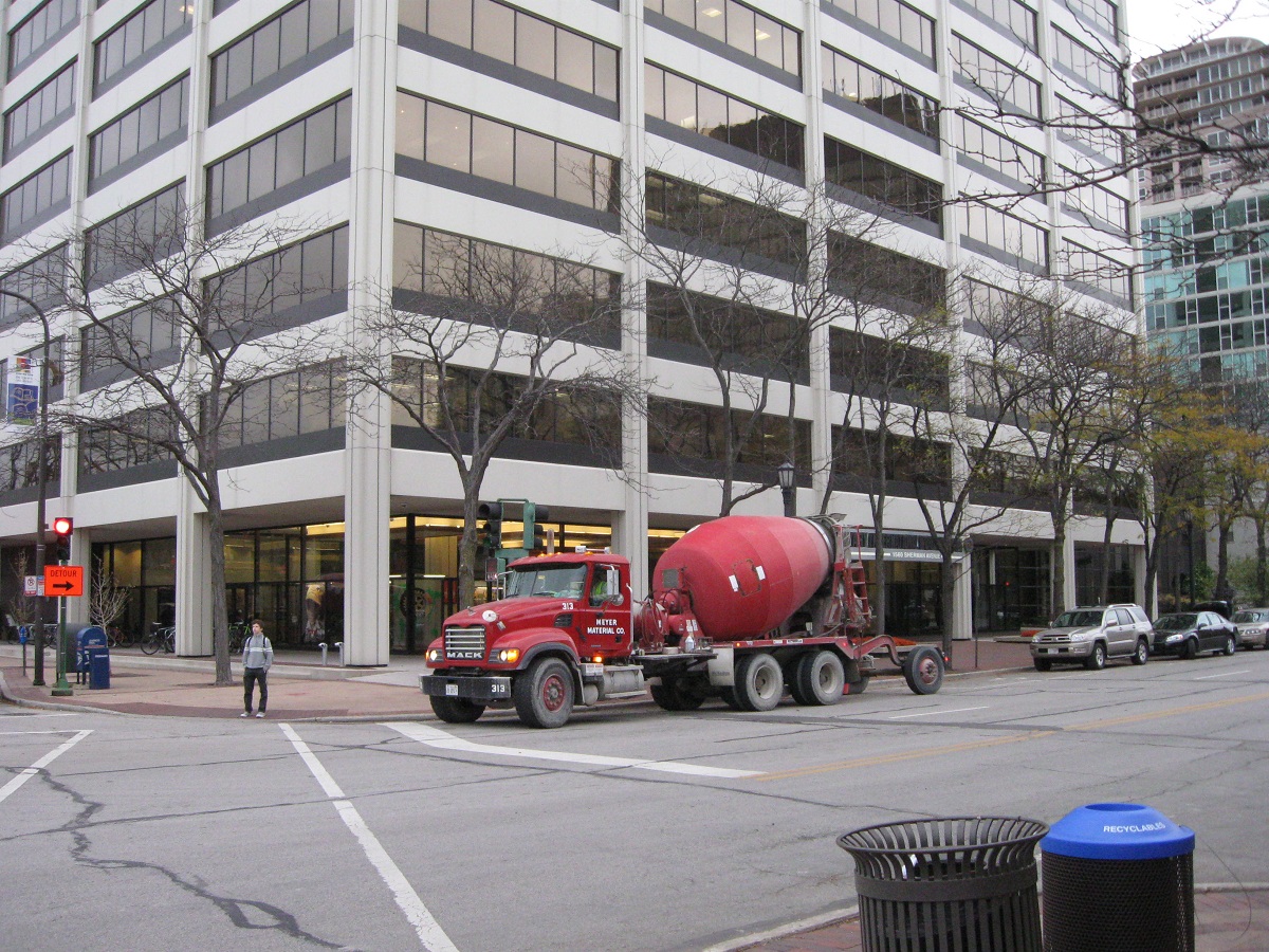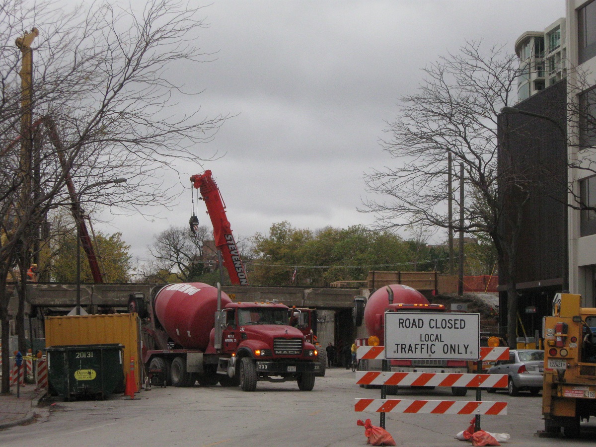 Several concrete trucks lined up waiting to deliver their load. It takes six trucks to totally fill the caison!