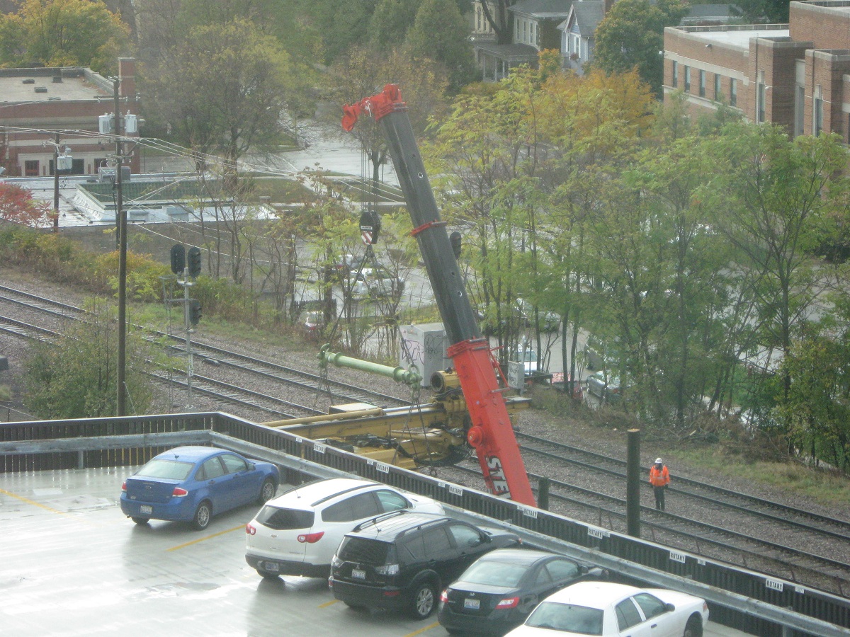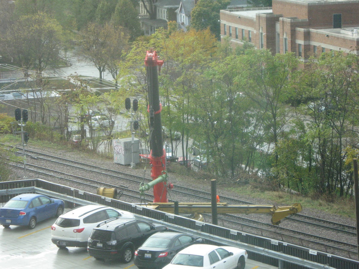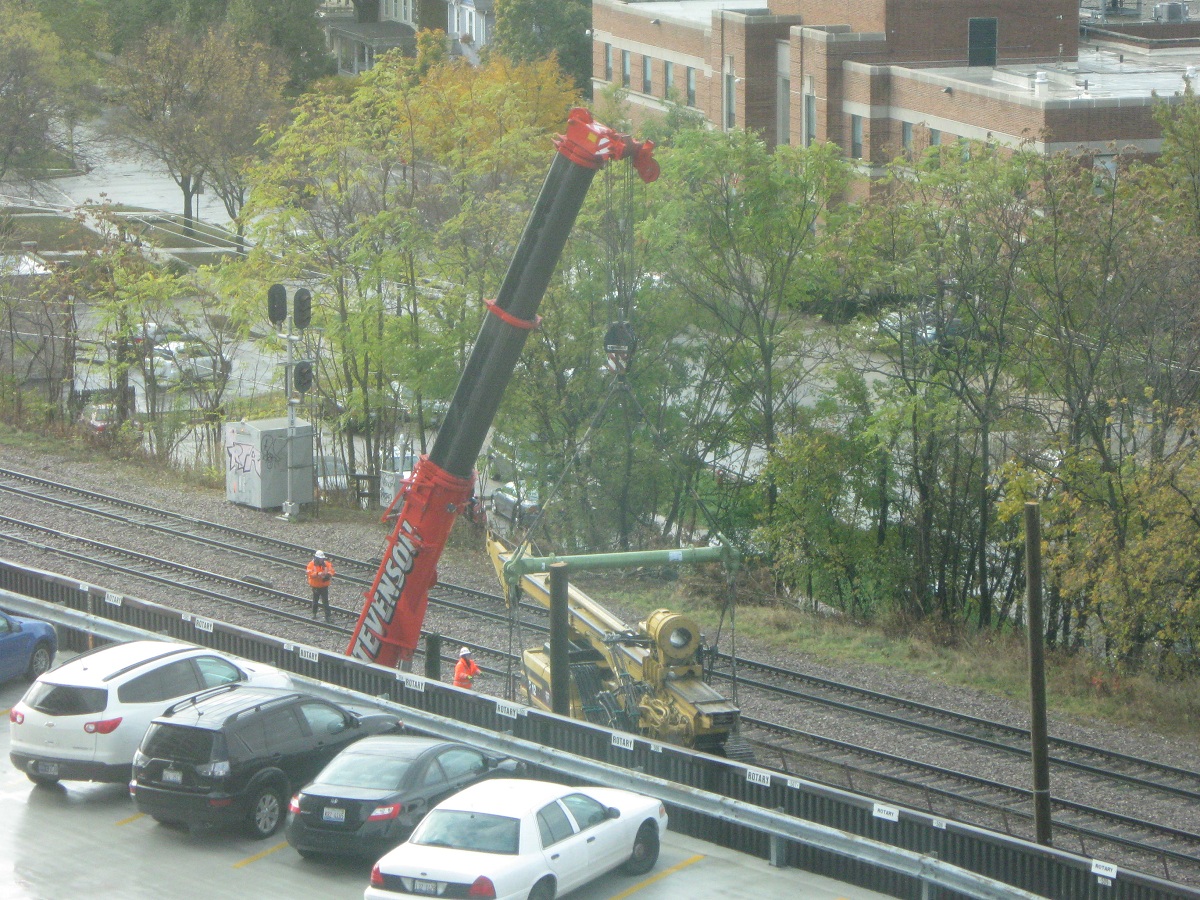 The yellow digger is carefully swung around over the CTA tracks. (A southbound train was held up over 5 minutes).