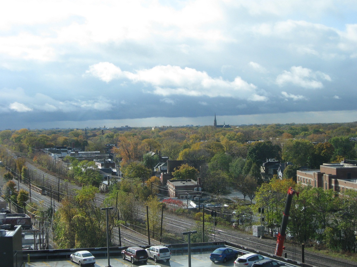The yellow digger is safely on the road. A brief hole of sunlight shows many of the yellow late fall colors over Evanston.