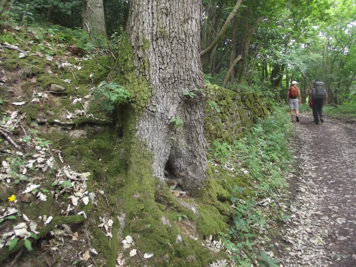 Lots of moss on tree and stone wall with Jo and Sherry