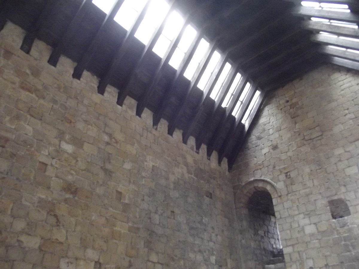 Halfway up castle in large room with skylights