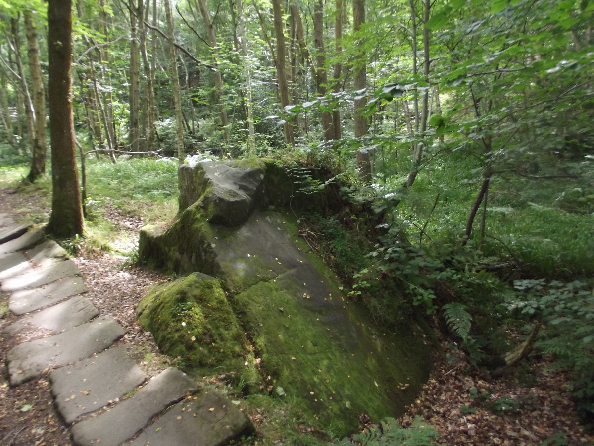 Forest with moss on rock and trail stones