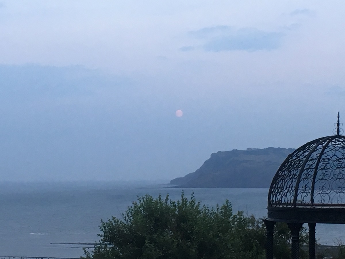 Pink (almost) full moon rising over cliff