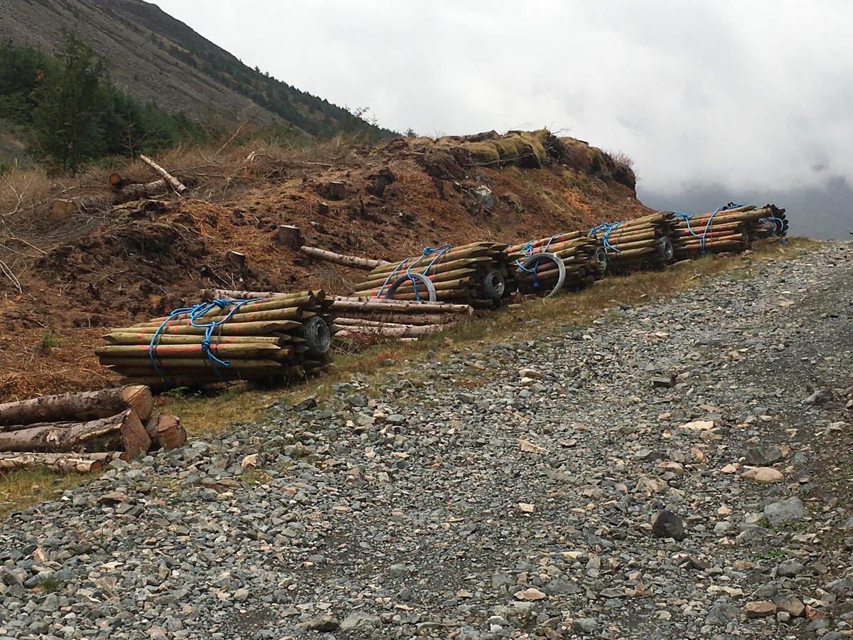 Stacked and bound logs for fenceposts