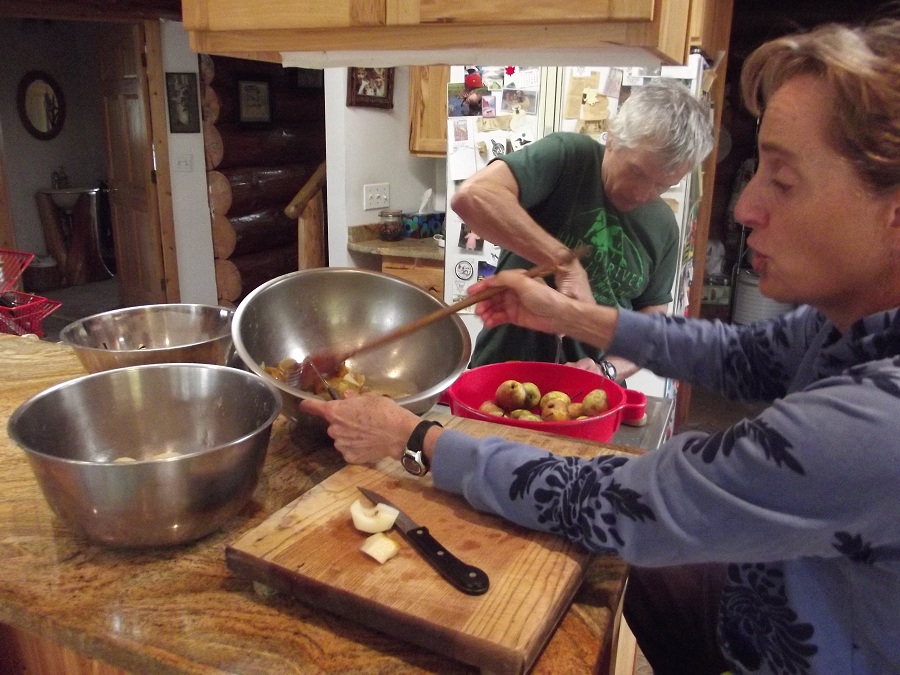 Carol stirring the bowl with the pear peels. Eventually Jim will turn them into delicous pear juice!