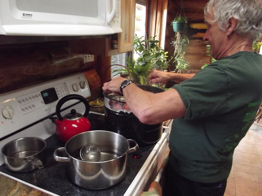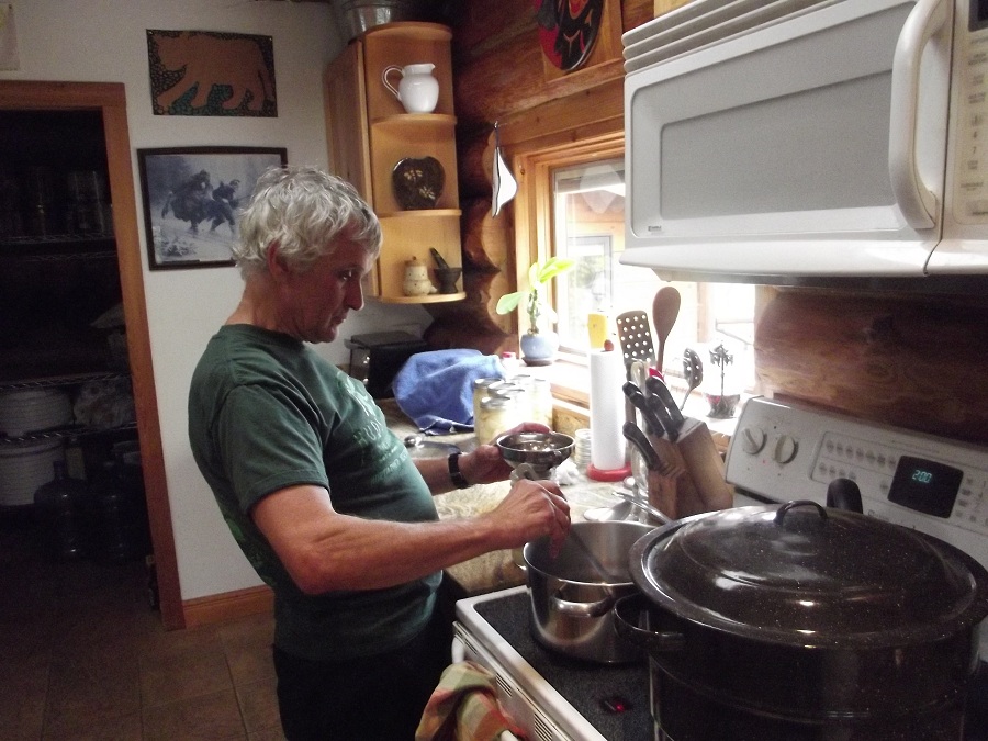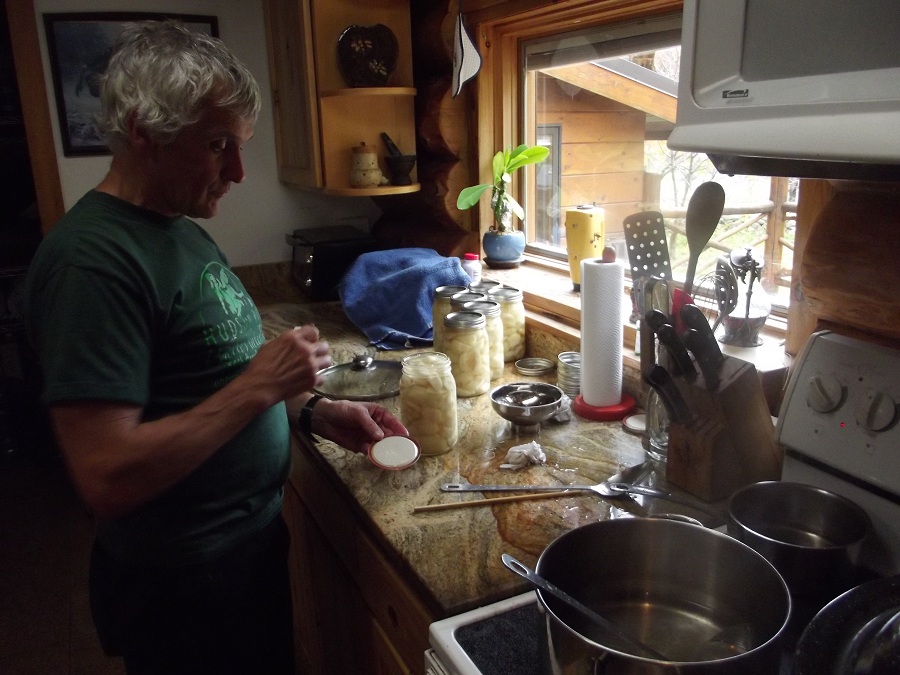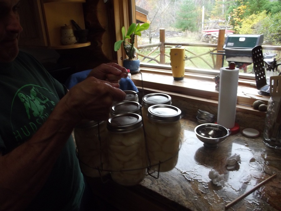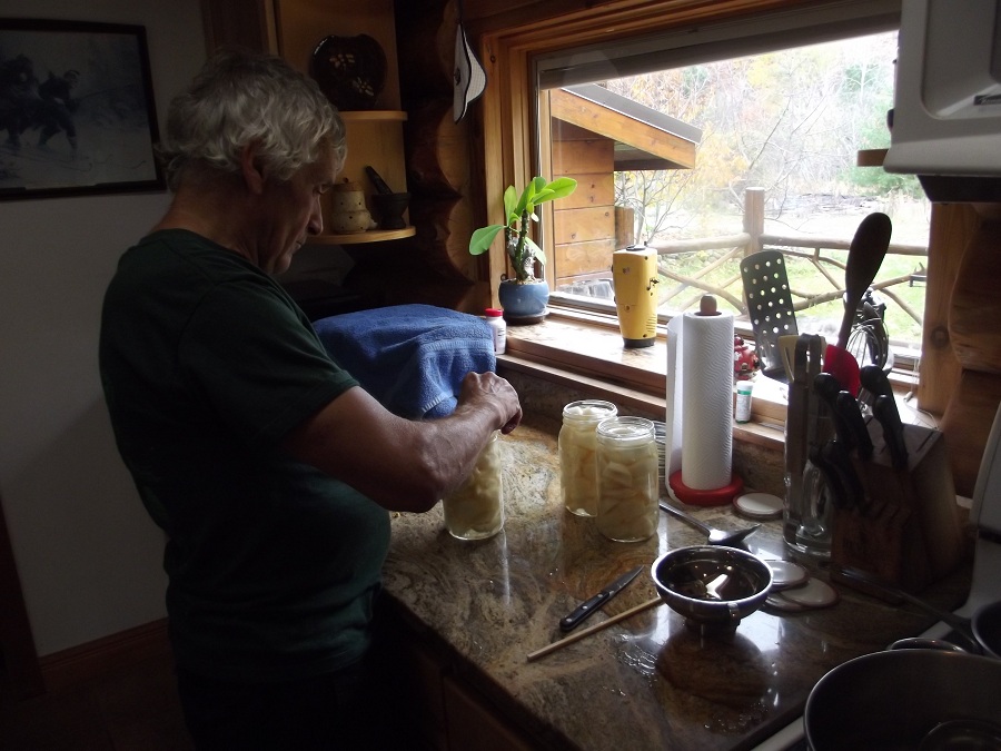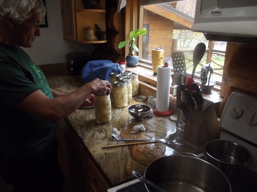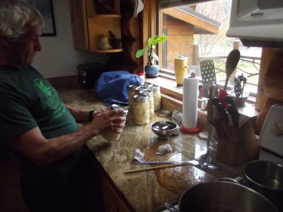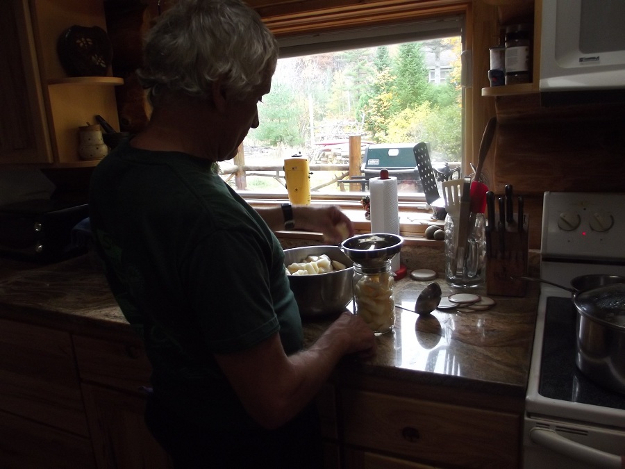 Jim adding many good pear pieces to one of their many glass jars