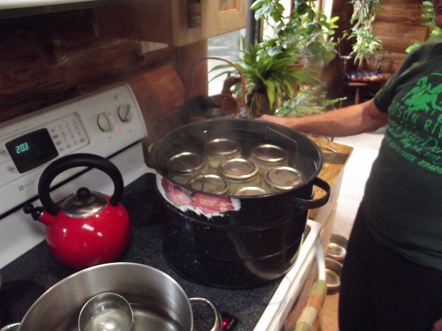 Next Jim carefully fills the pear jars with sugar syrup almost (about 3/16") to the top -- the large black pot at the right holds boiling water in which they will be processed