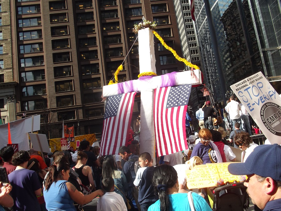A white cross with two US flags