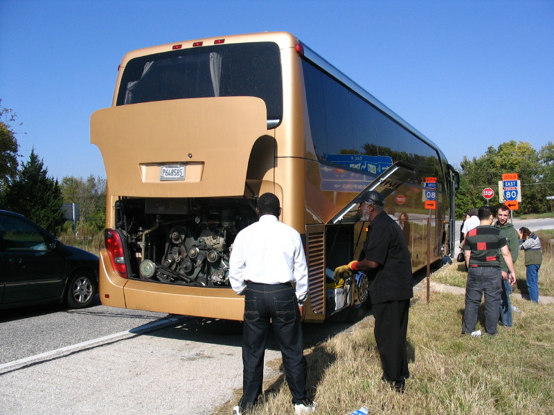 Our first breakdown stop with Walter examining the bus engine