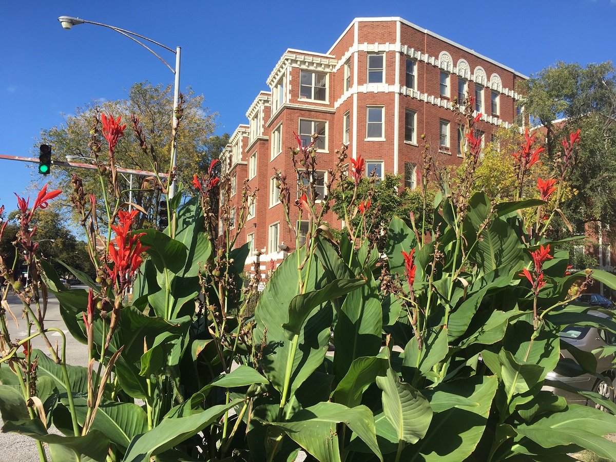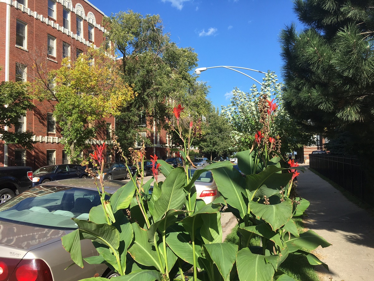 Red flowers at Jarvis and Sheridan in Chicago