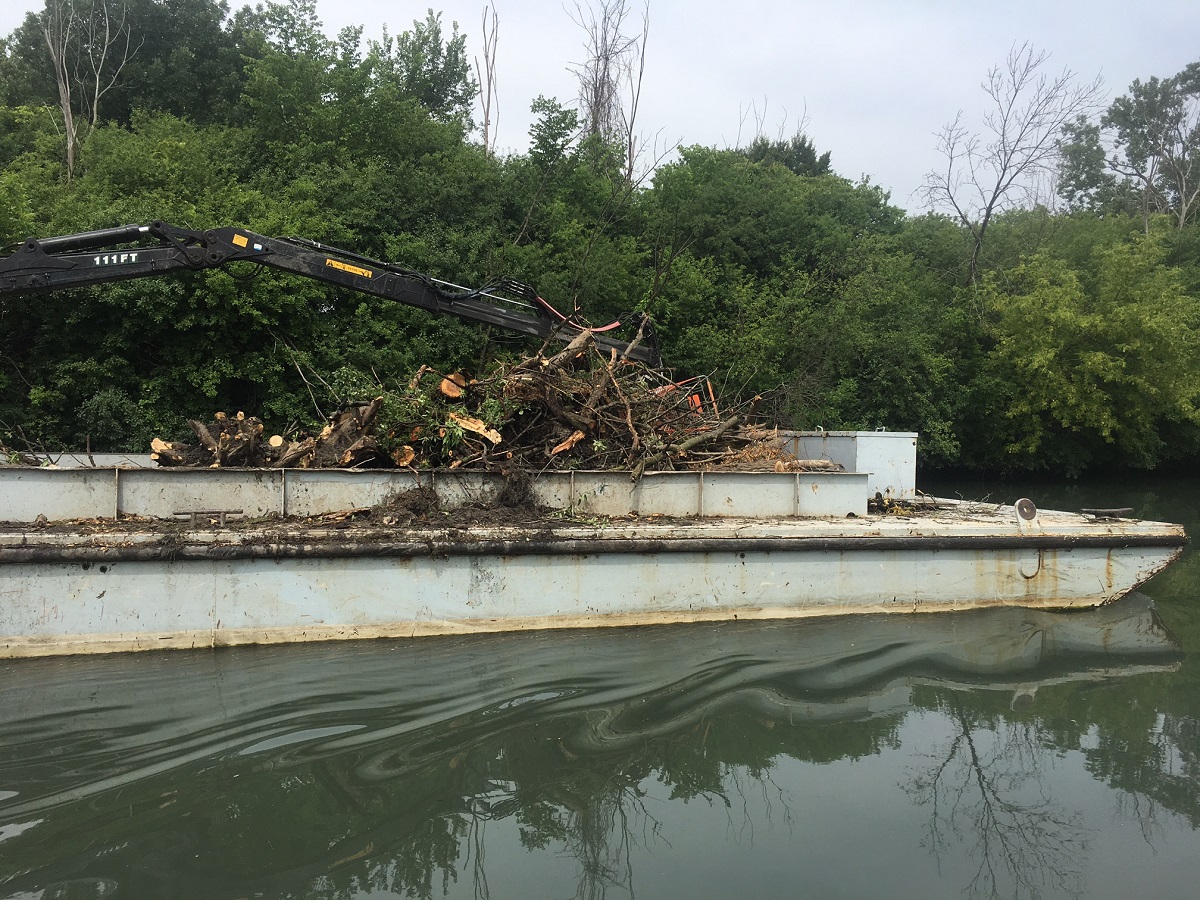 A tug pushing large barge goes past dock while we are preparing to scull -- Tuesday 7/11/17