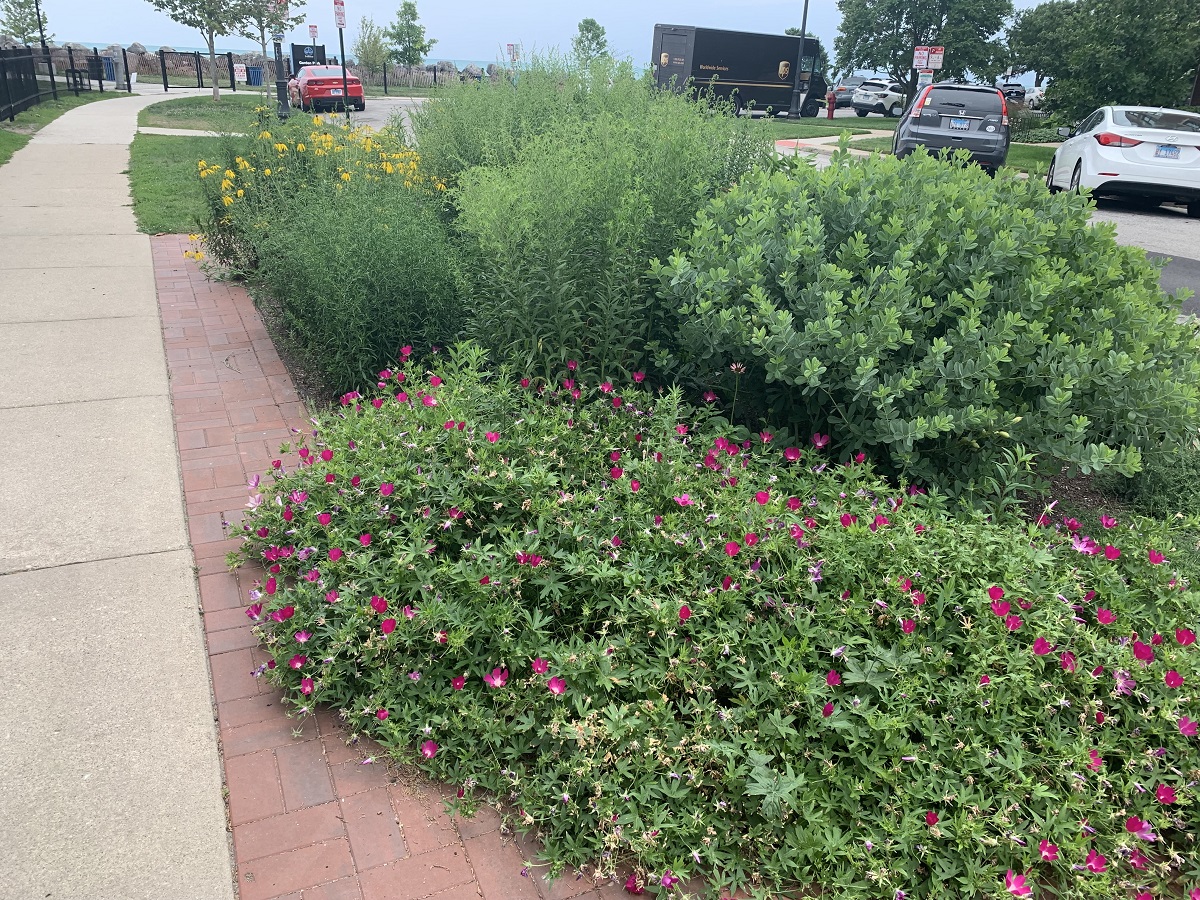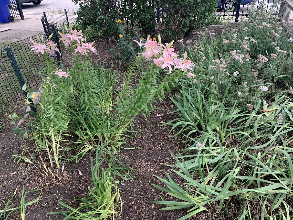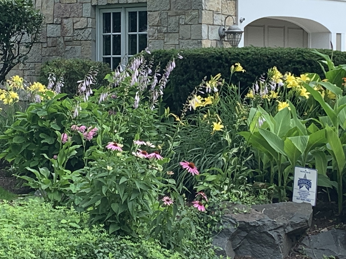 Yellow lillies, purple cone flowers, and blue ones on Edgemere Court