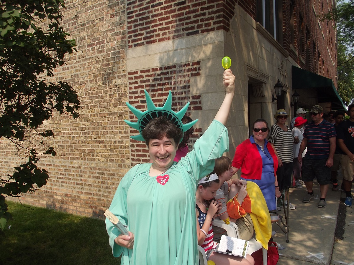 One lady from Evanston Public Library Precision Book Cart Drill Team