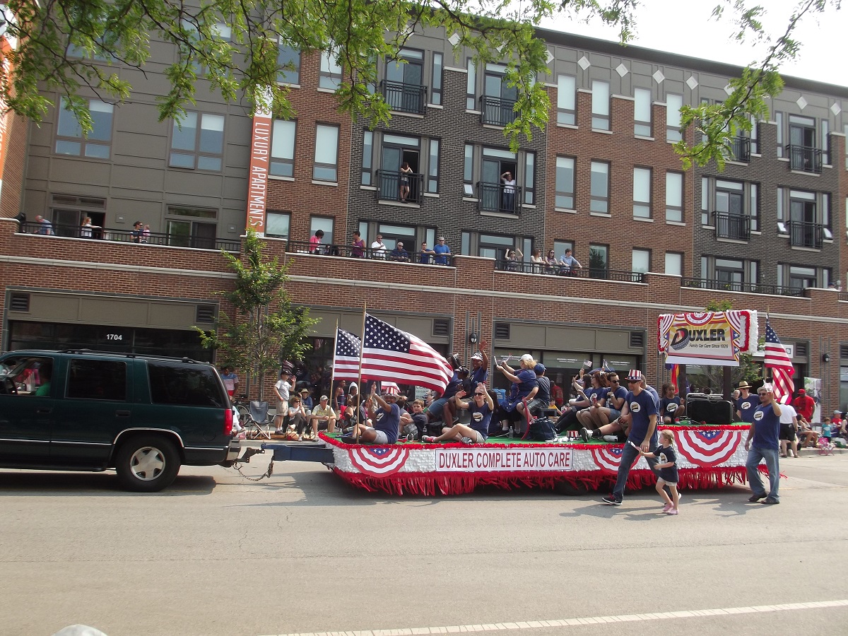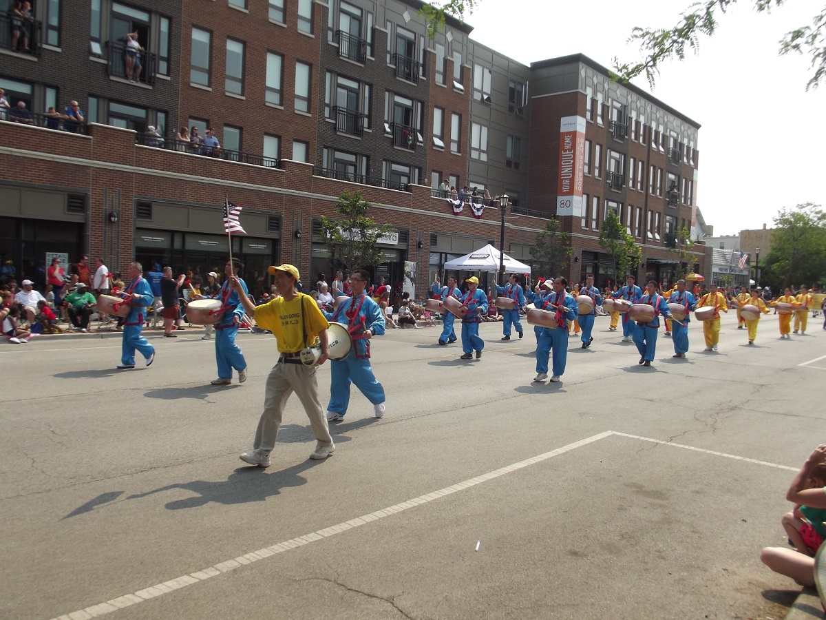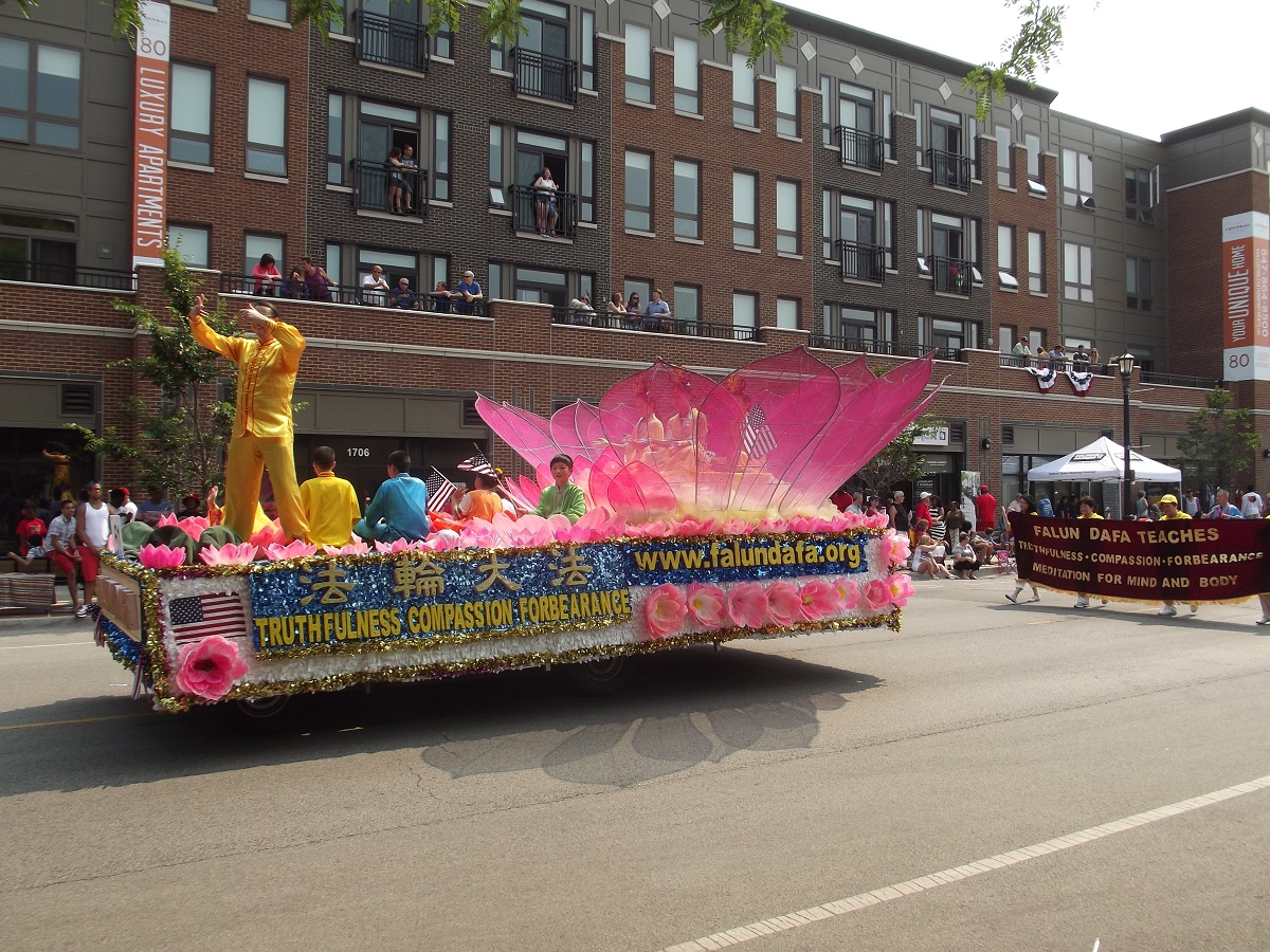 Mid-USA Falun Dafa Association -- (note: Andy had to leave the parade after this float [61 out of 100] to go home and change for Chicago fireworks cruise with Bill)